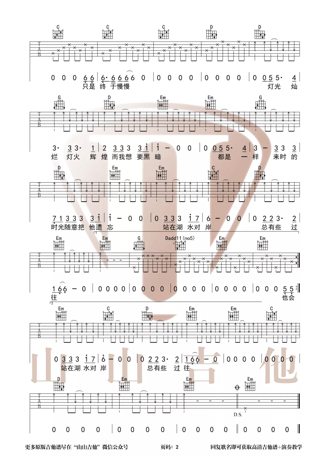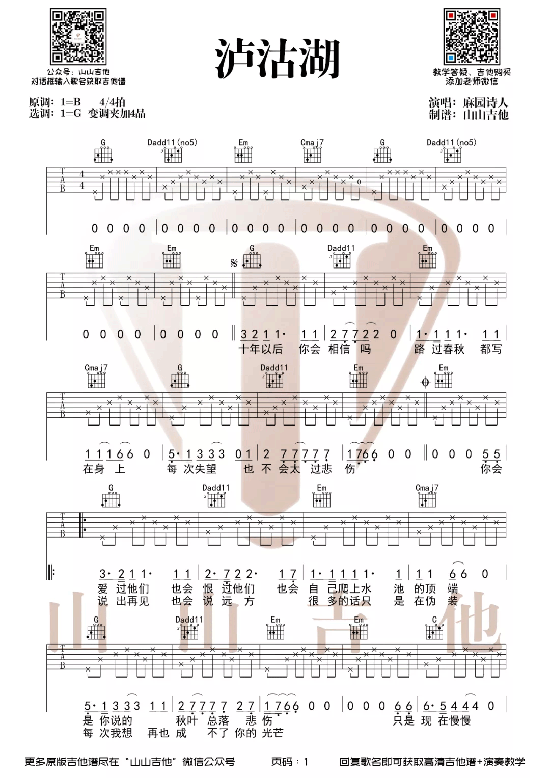 曲谱介绍: 麻园诗人《泸沽湖》吉他弹唱谱,采用G调指法编配,共有2张高清图谱,免翻页排版设计。