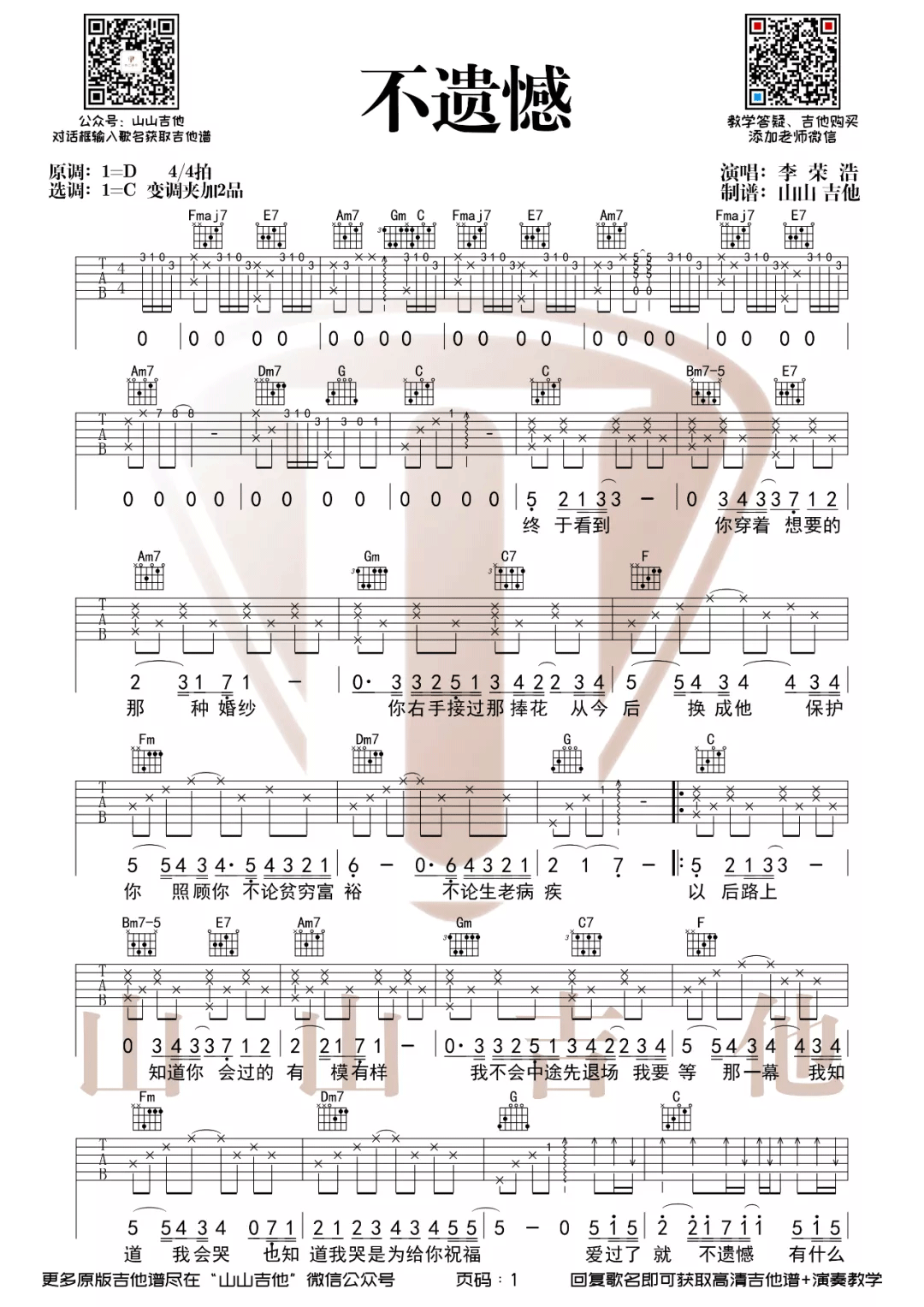曲谱介绍: 李荣浩《不遗憾》吉他弹唱谱,采用C调指法编配原版,共有2张高清图谱,免翻页排版设计。
