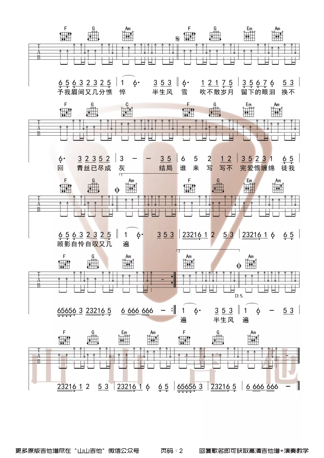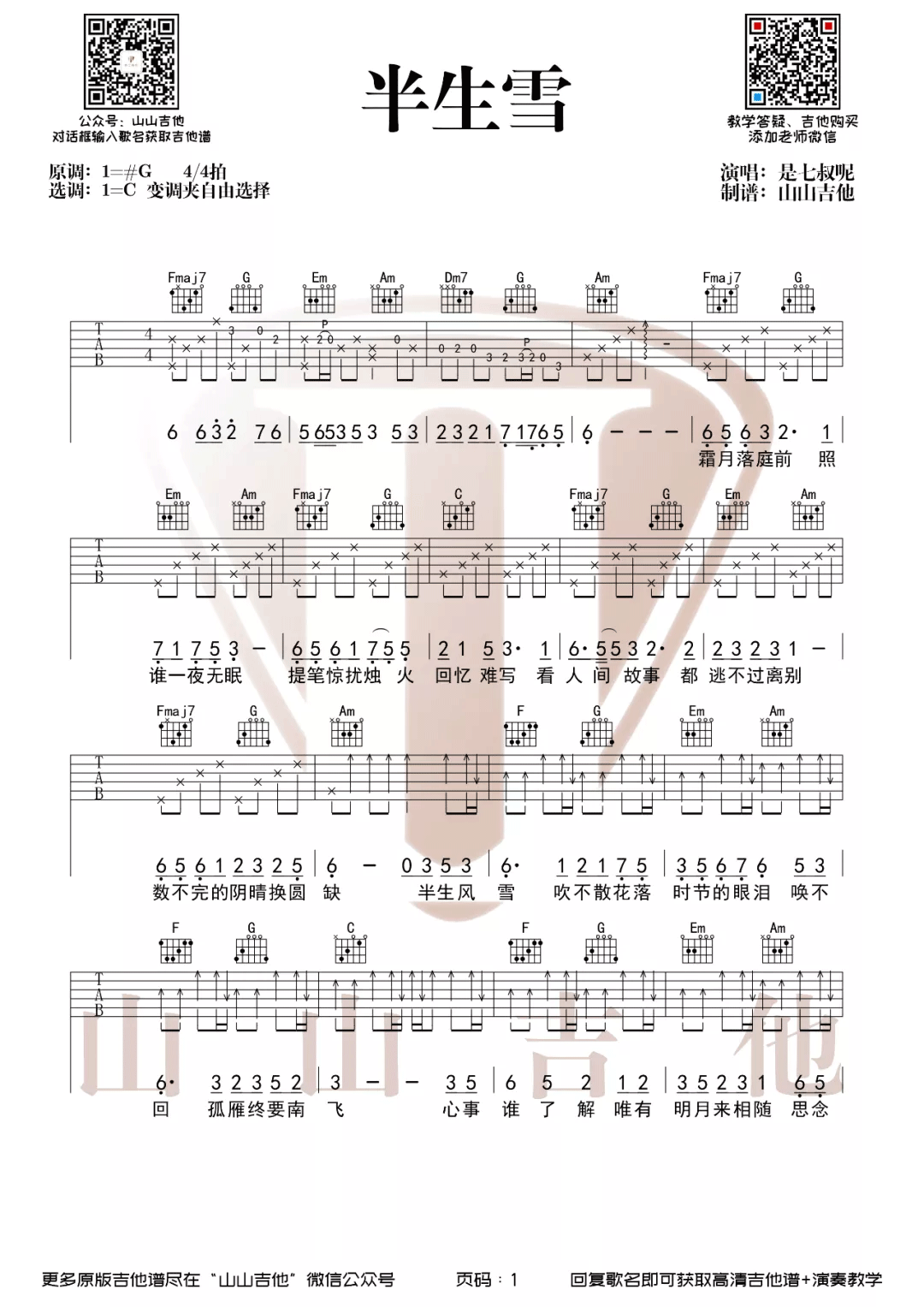 曲谱介绍: 是七叔呢《半生雪》吉他弹唱谱,采用C调指法编配原版,共有2张高清图谱,免翻页排版设计。