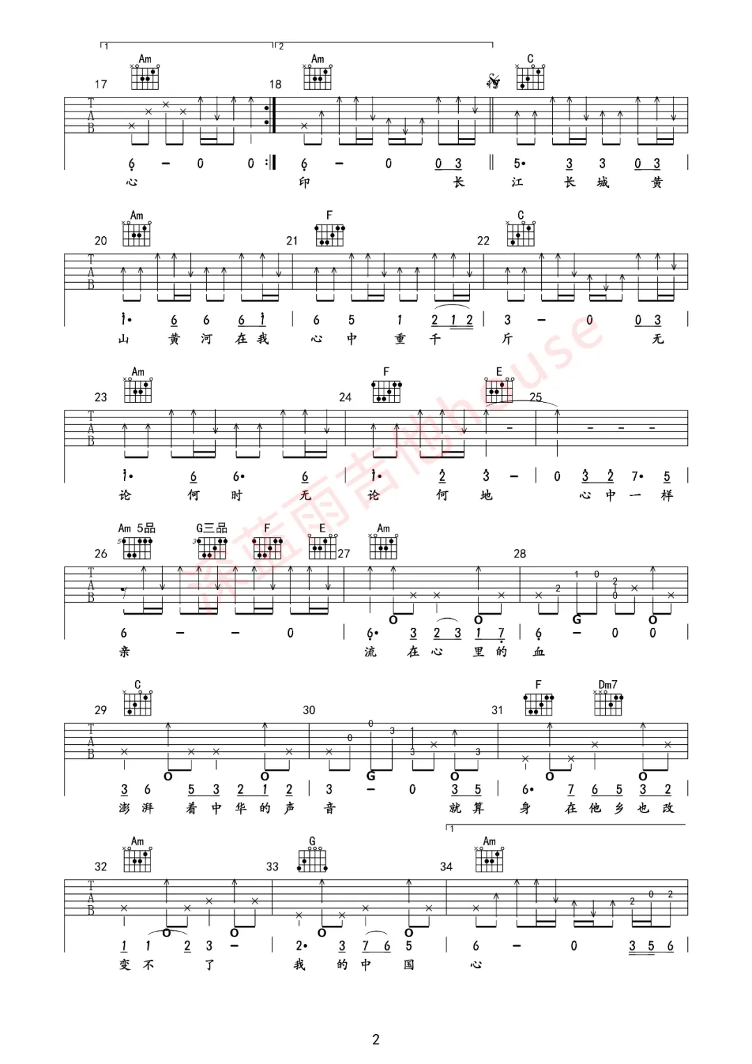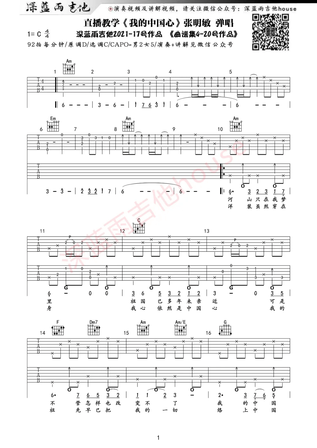 曲谱介绍: 张明敏《我的中国心》吉他弹唱谱,采用C调指法编配,共有3张高清图谱。