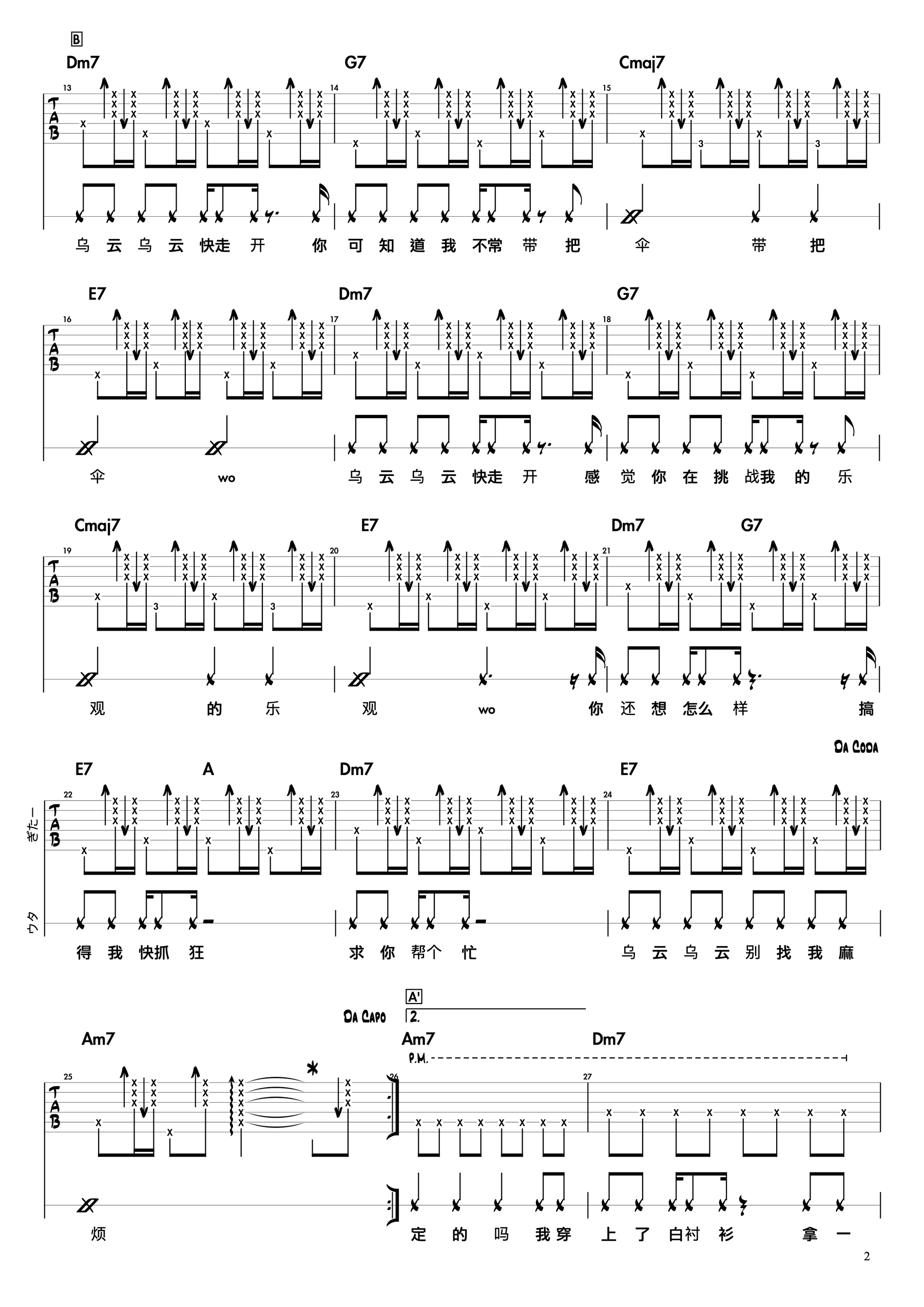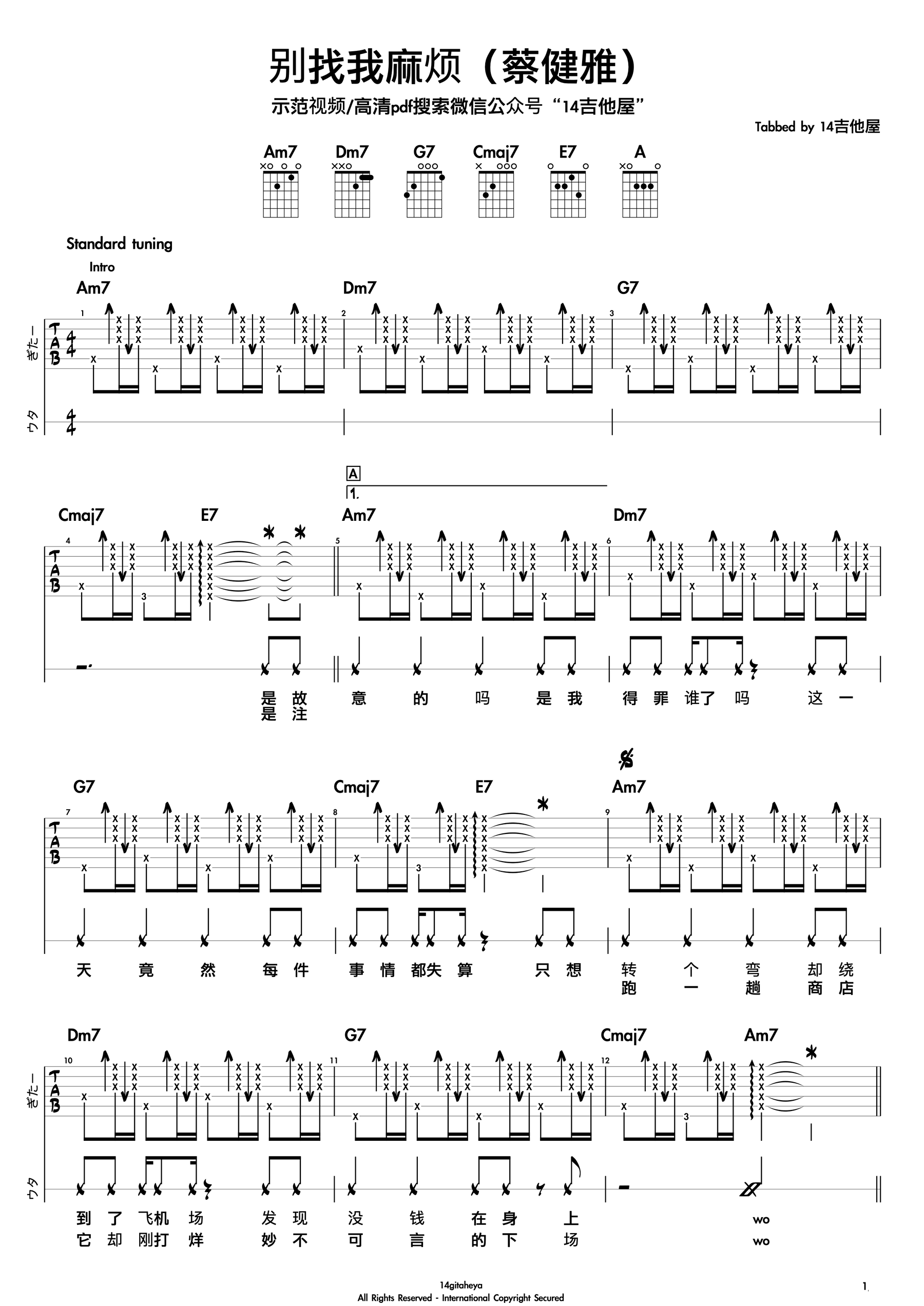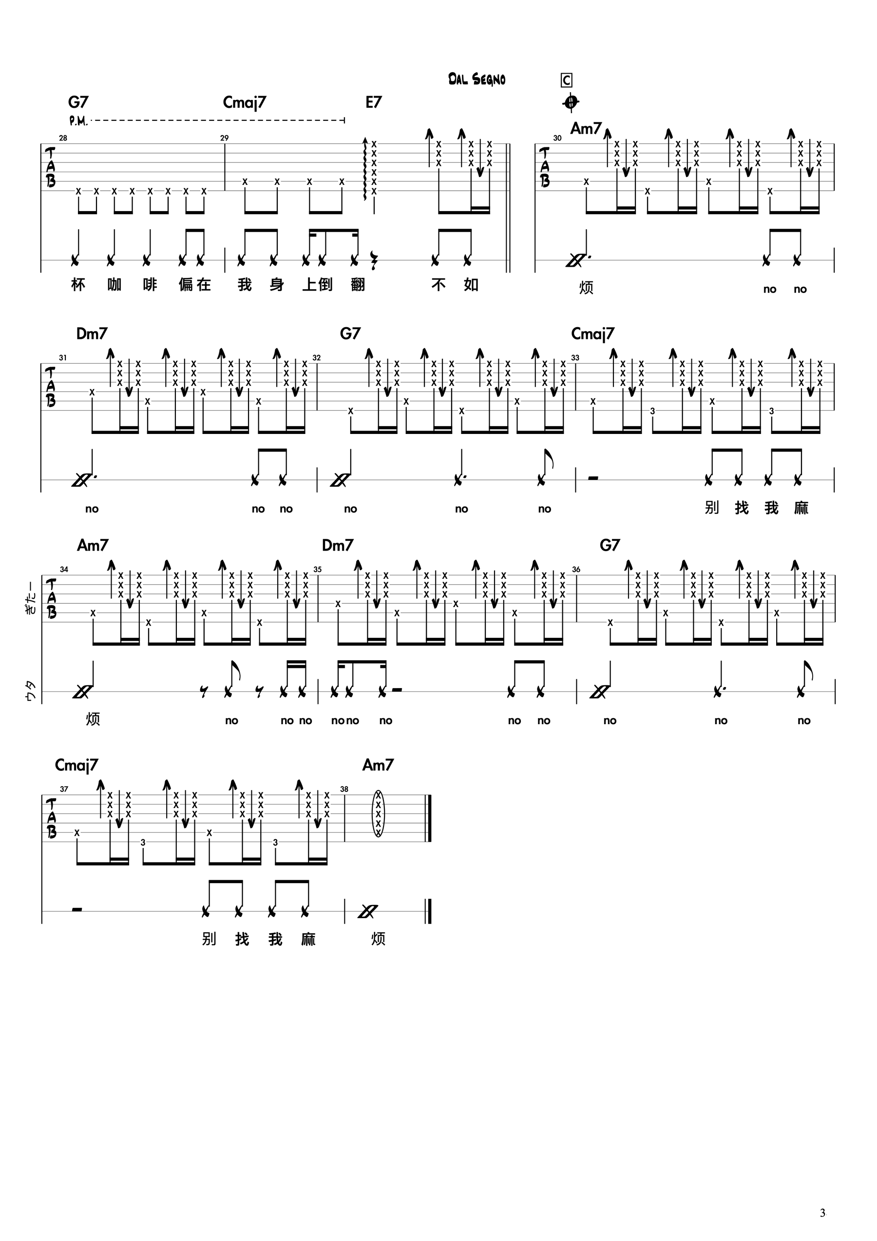 曲谱介绍: 蔡健雅《别找我麻烦》吉他弹唱谱,采用C调指法编配,共有3张高清图谱。