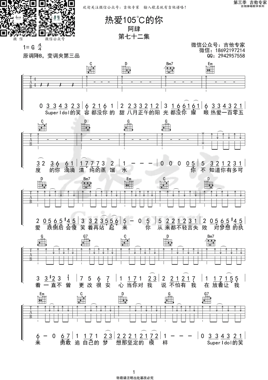 曲谱介绍: 阿肆《热爱105度的你》吉他弹唱谱,采用G调指法编配原版,共有2张高清图谱,免翻页排版设计。