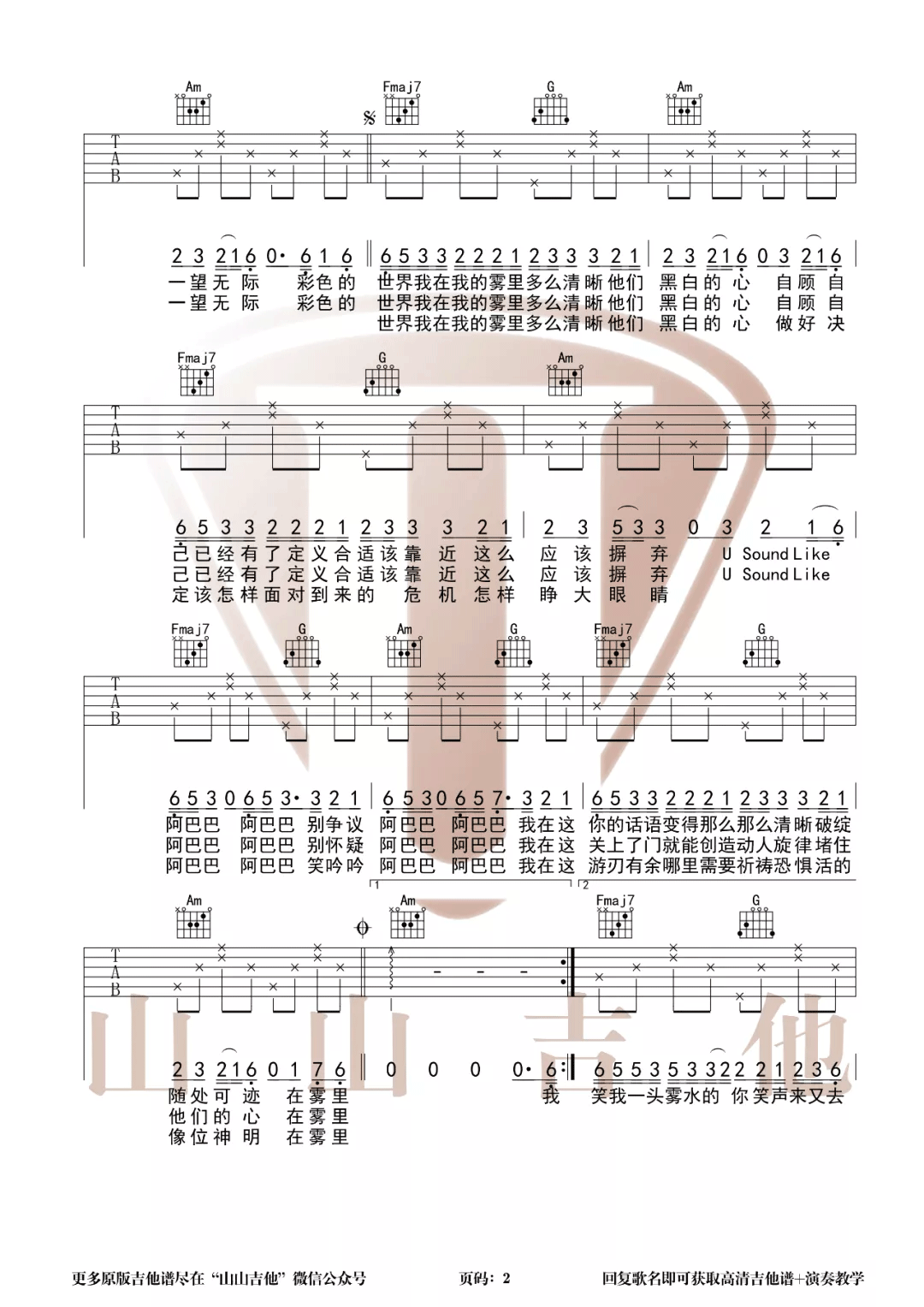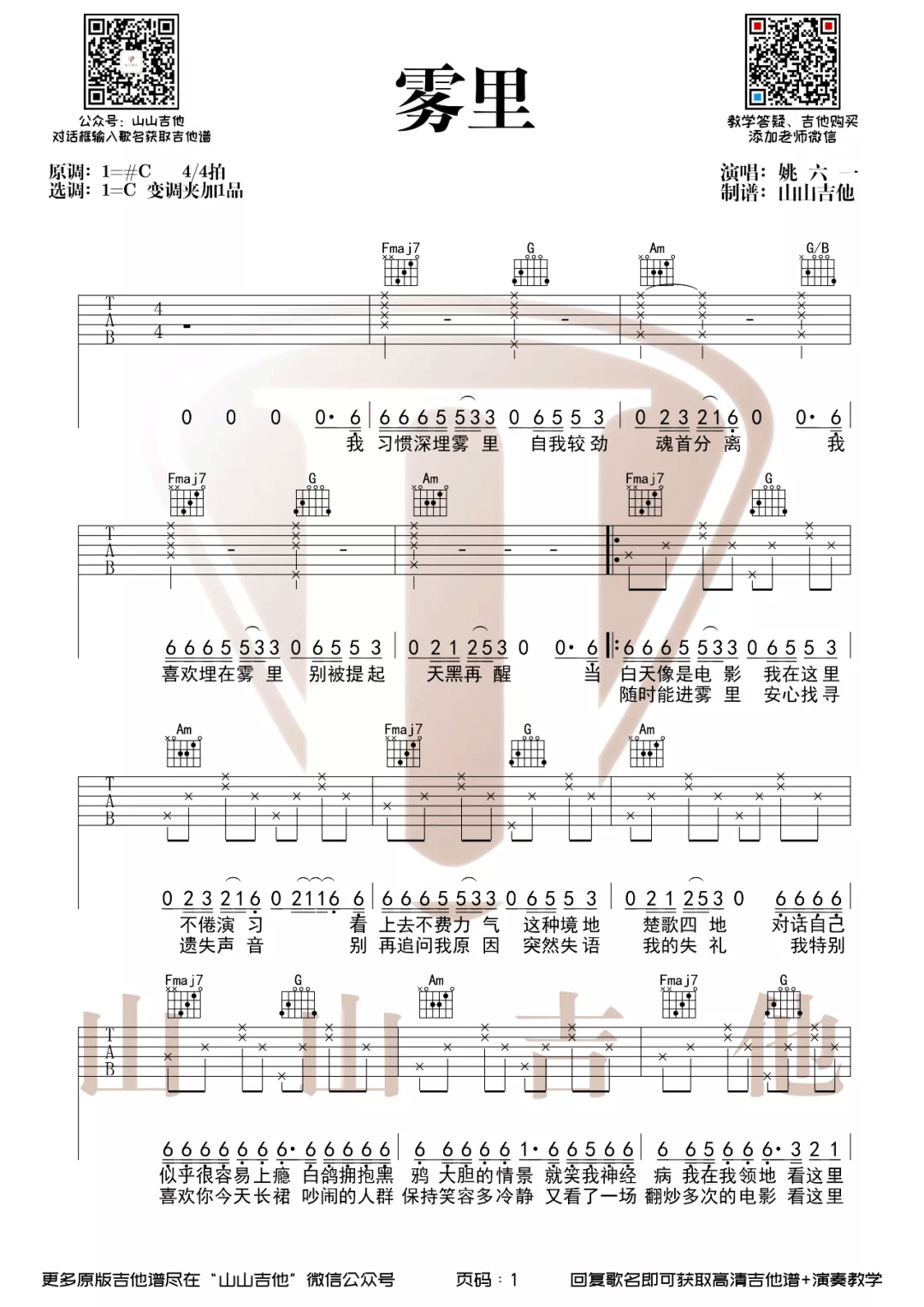 曲谱介绍: 姚六一《雾里》吉他弹唱谱,采用C调指法编配,共有3张高清图谱。