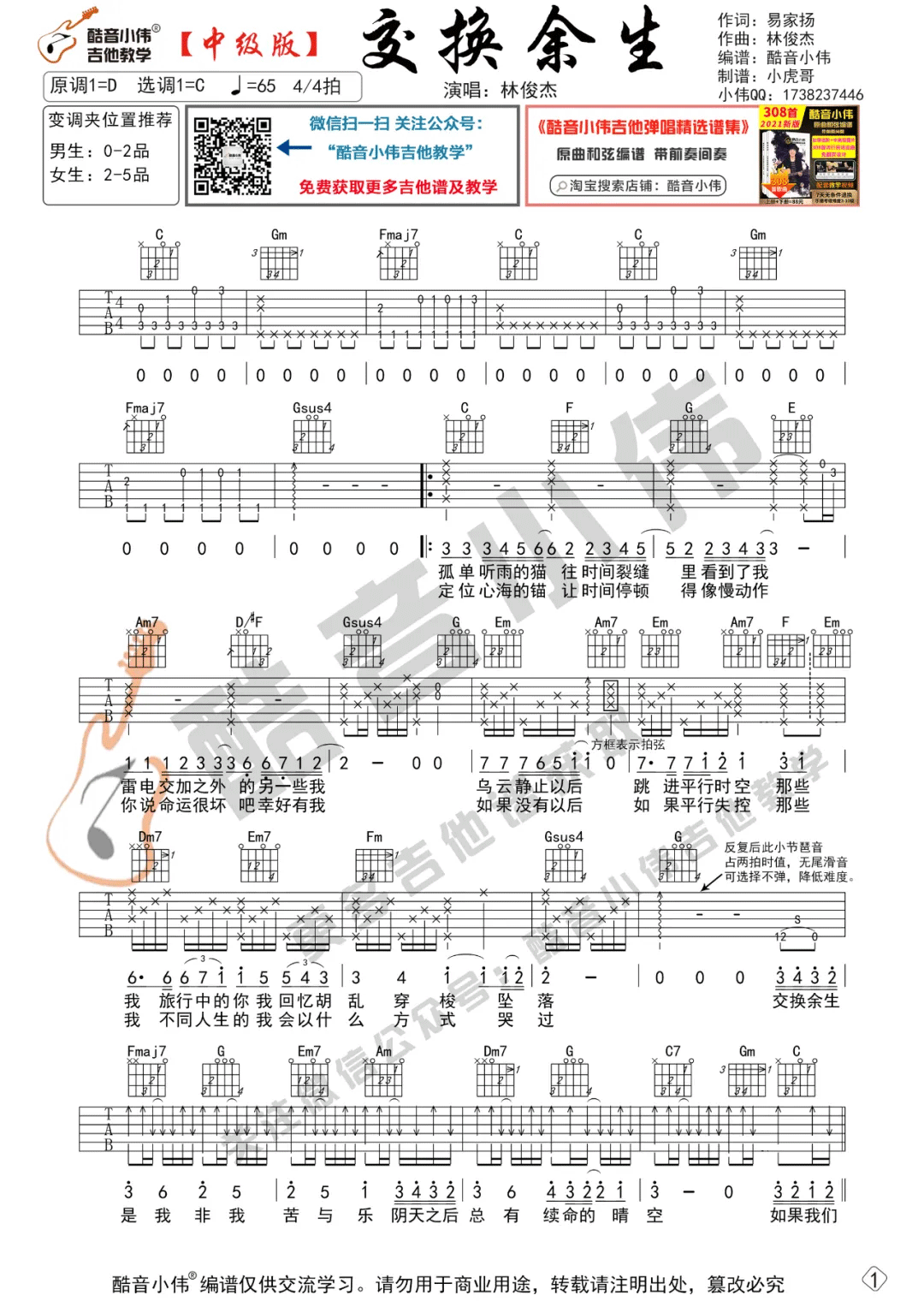 曲谱介绍: 林俊杰《交换余生》吉他弹唱谱,采用C调指法编配原版,共有2张高清图谱,免翻页排版设计。