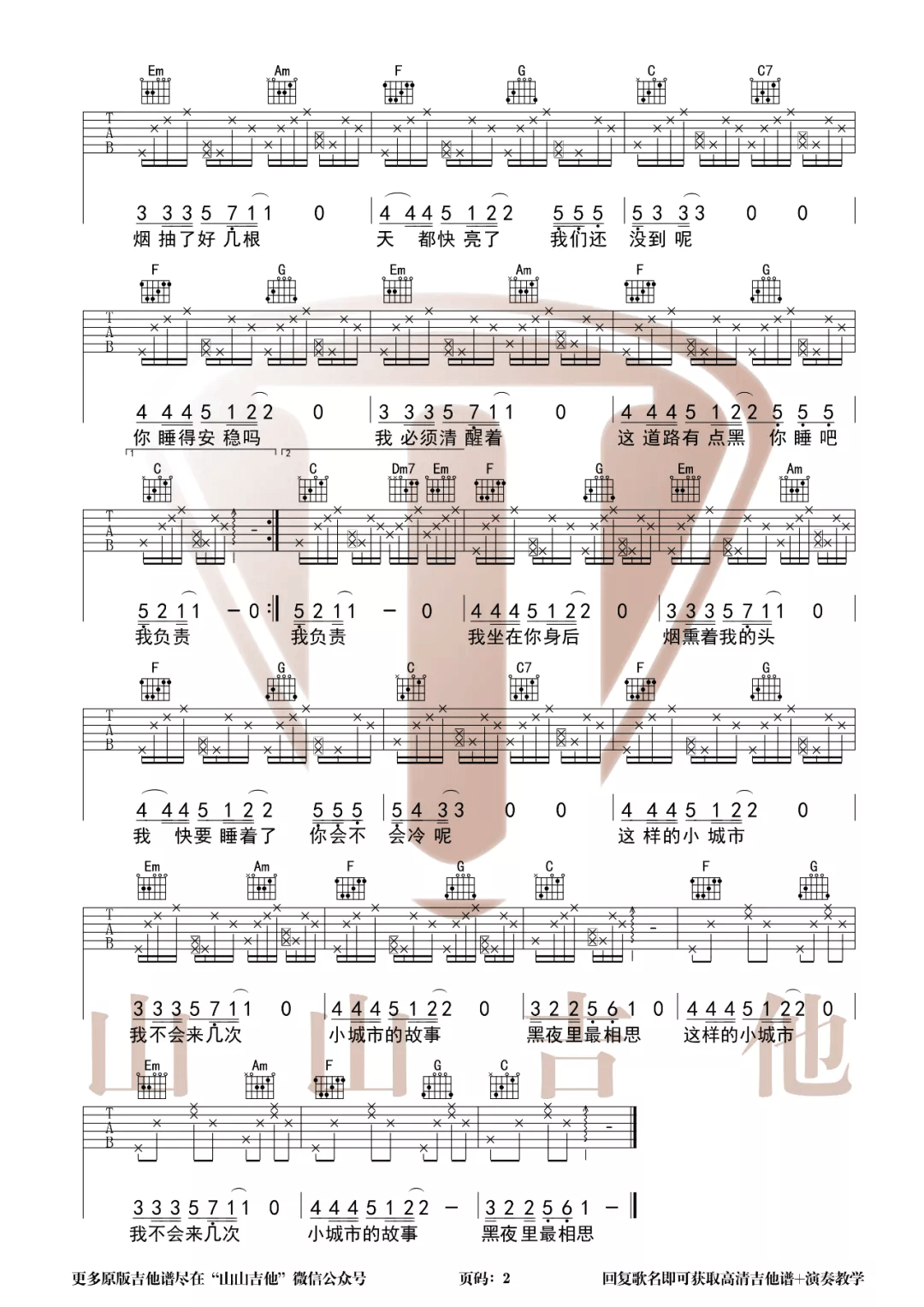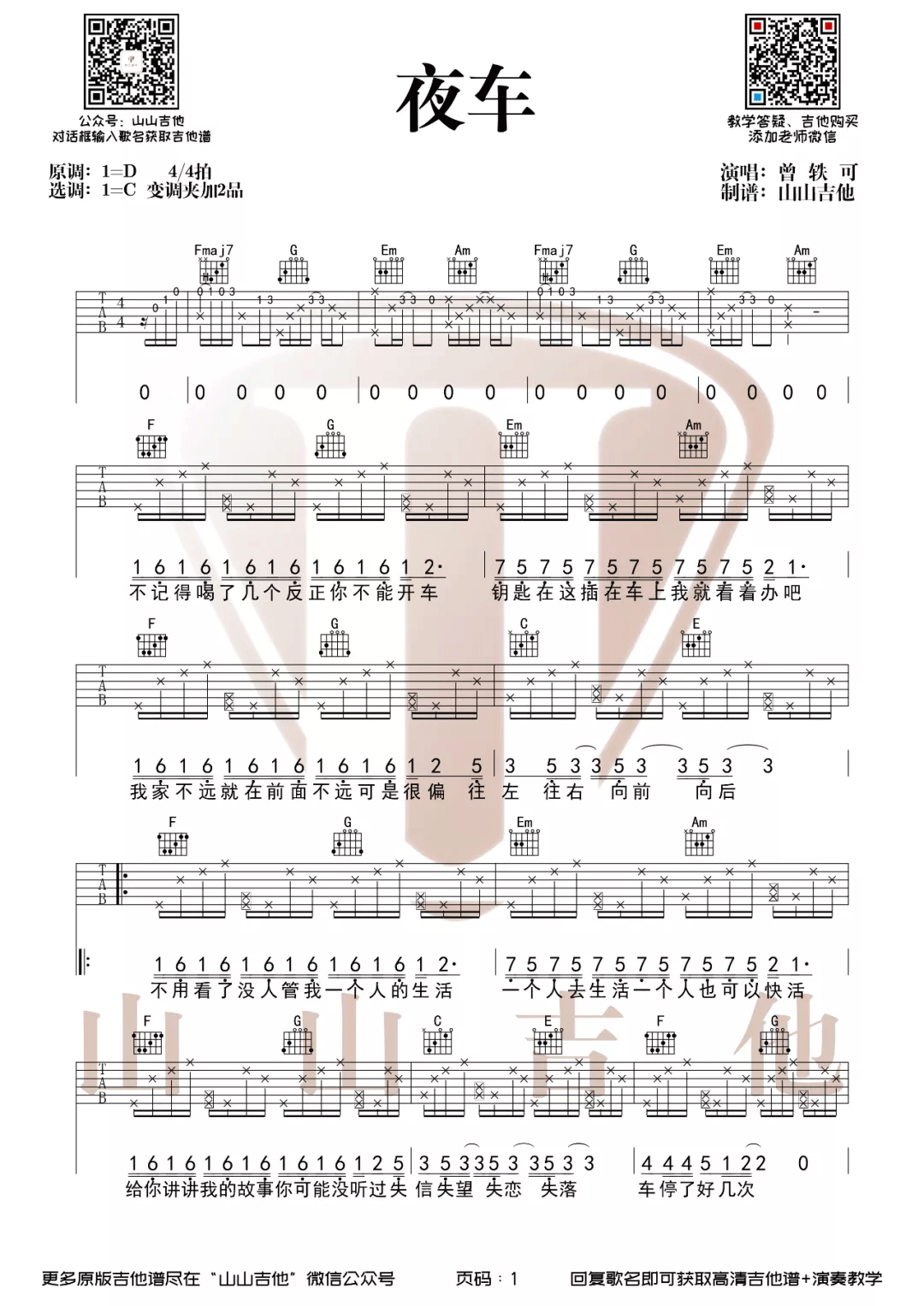 曲谱介绍: 曾轶可《夜车》吉他弹唱谱,采用C调指法编配原版,共有2张高清图谱,免翻页排版设计。