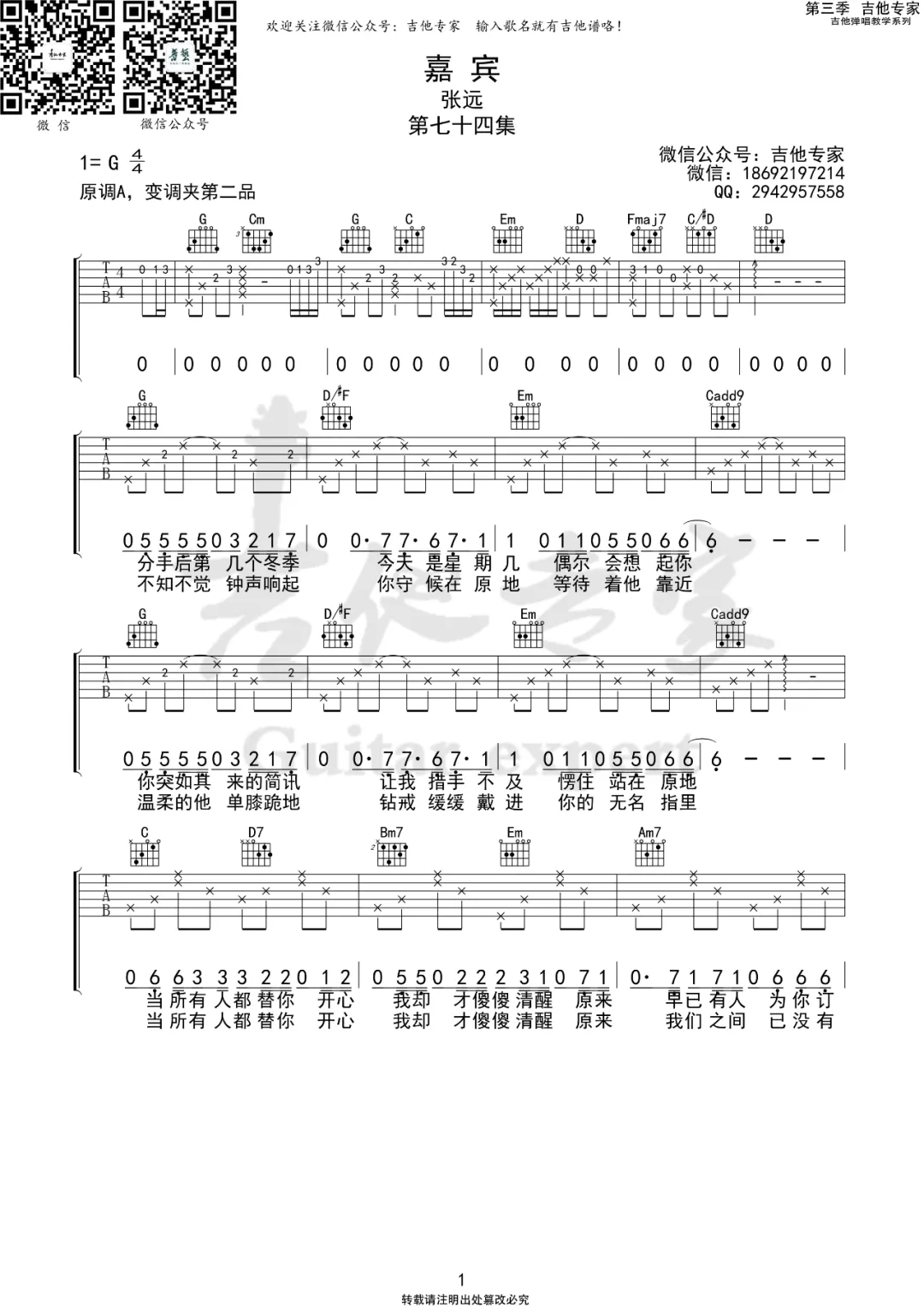 曲谱介绍: 张远《嘉宾》吉他弹唱谱,采用G调指法编配原版,共有3张高清图谱。