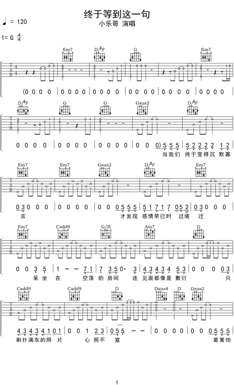 曲谱介绍: 小乐哥《终于等到这一句》吉他弹唱谱,采用G调指法编配原版,共有5张高清图谱。