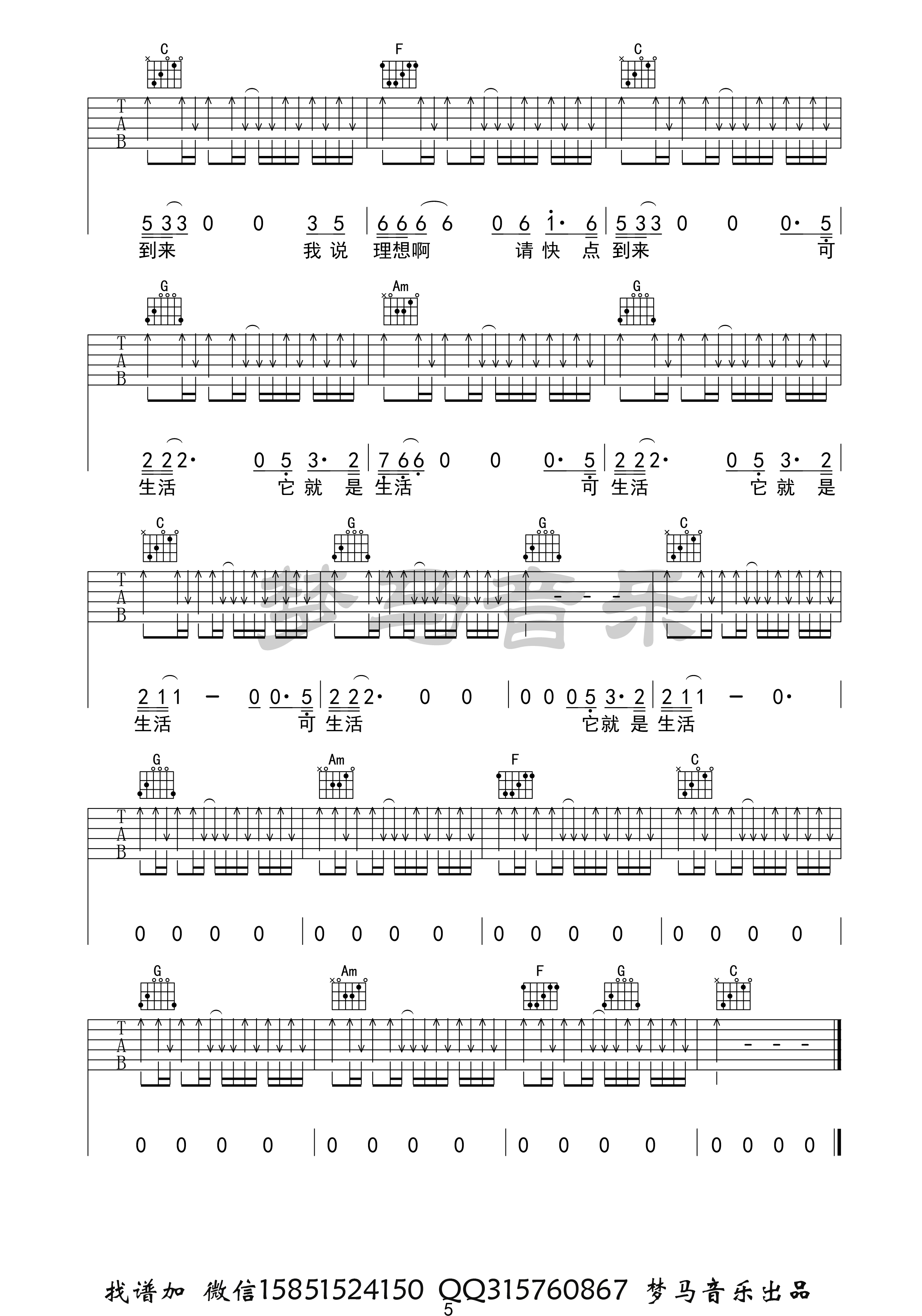 曲谱介绍: 张闯《生活它还是生活》吉他弹唱谱,采用C调指法编配,共有5张高清图谱。