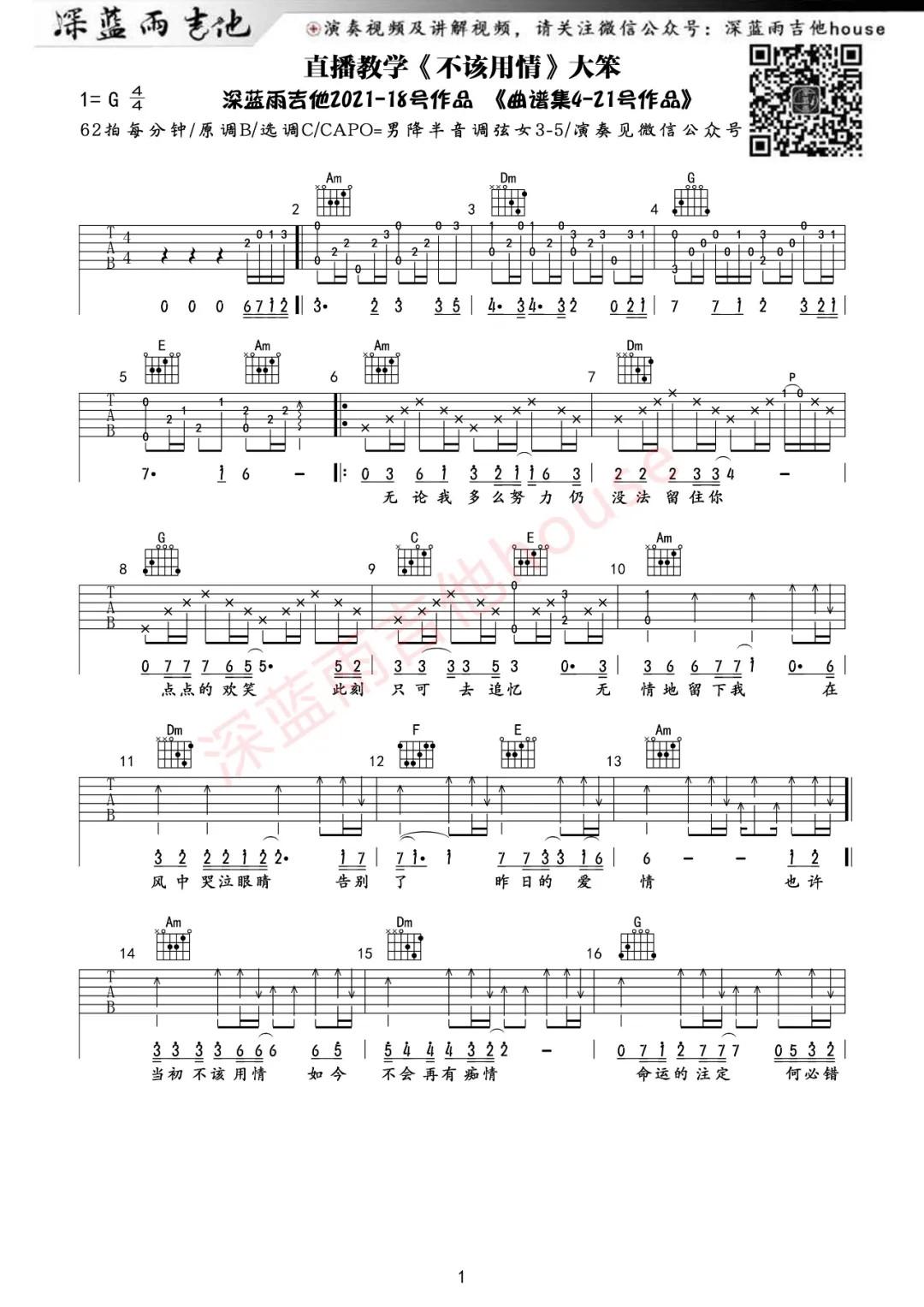 曲谱介绍: 大笨《不该用情》吉他弹唱谱,采用C调指法编配,共有2张高清图谱,免翻页排版设计。