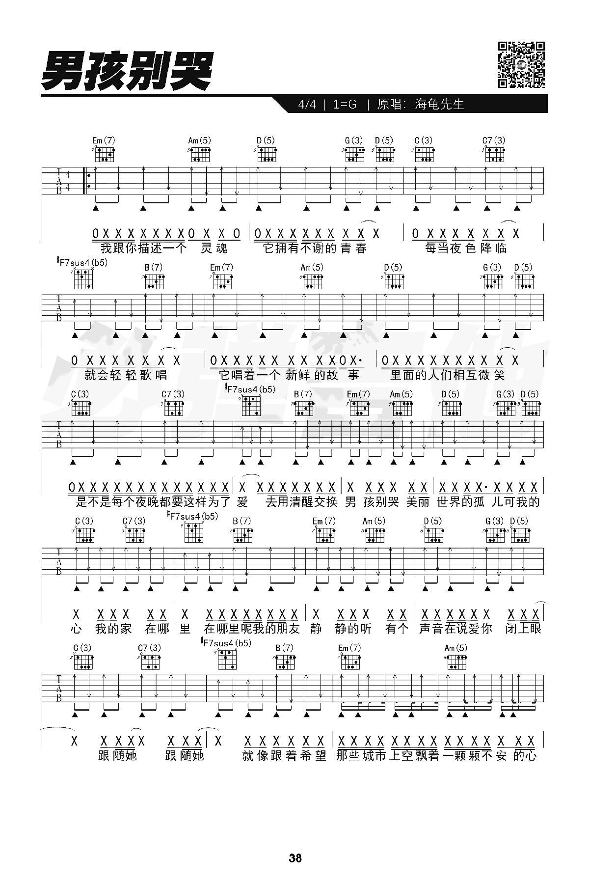 曲谱介绍: 海龟先生《男孩别哭》吉他弹唱谱,采用G调指法编配,共有4张高清图谱。