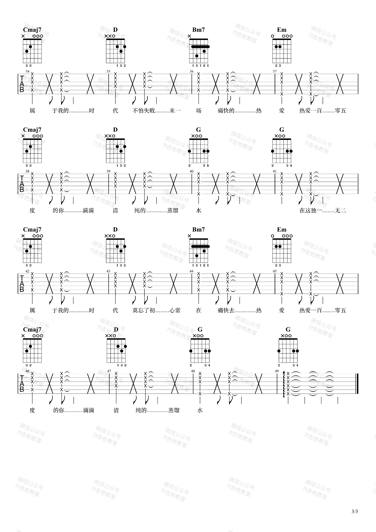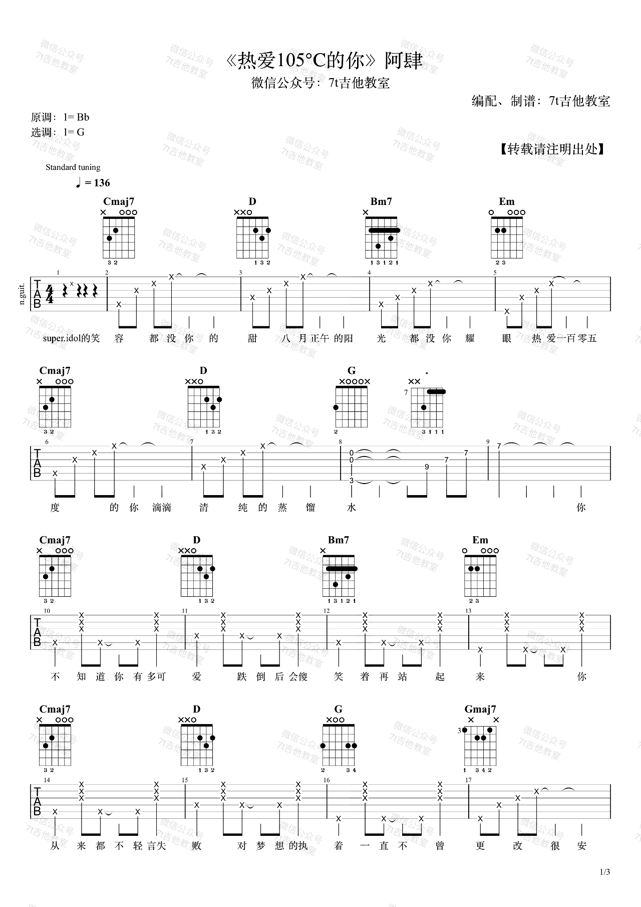 曲谱介绍: 阿肆《热爱105度的你》吉他弹唱谱,采用G调指法编配,共有3张高清图谱。