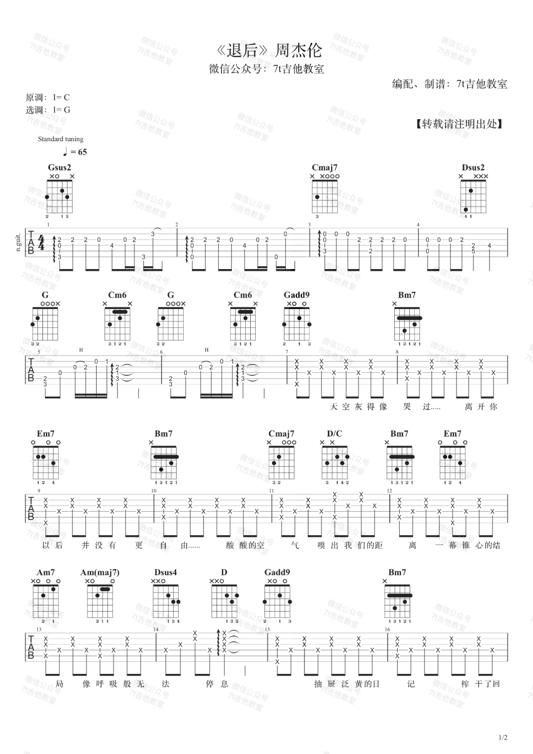 曲谱介绍: 周杰伦《退后》吉他弹唱谱,采用G调指法编配原版,共有2张高清图谱,免翻页排版设计。