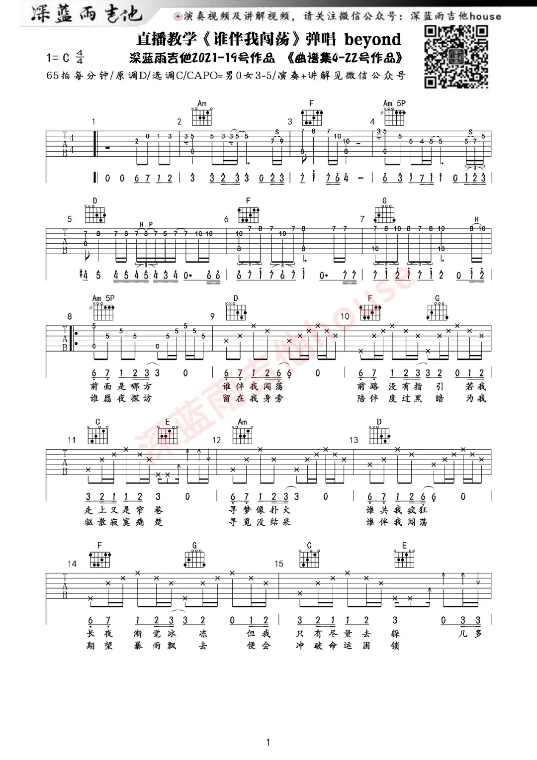 曲谱介绍: Beyond《谁伴我闯荡》吉他弹唱谱,采用C调指法编配原版,共有3张高清图谱。