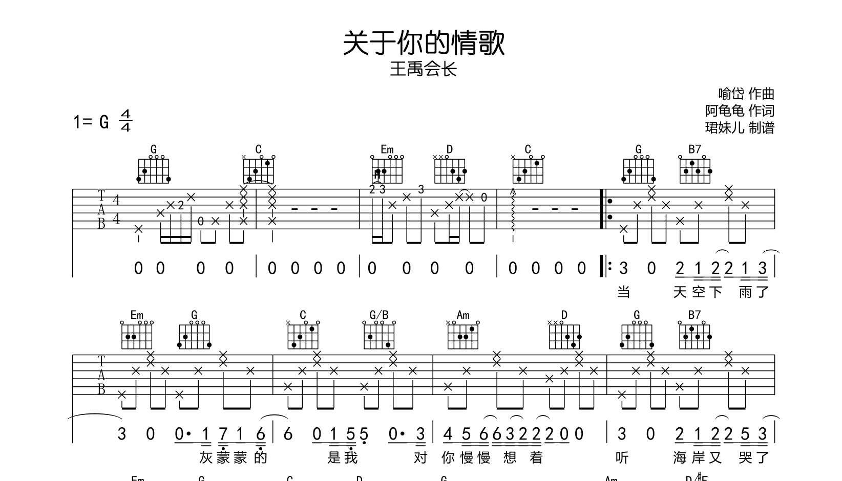关于你的情歌吉他谱 - 王禹会长 - G调吉他弹唱谱