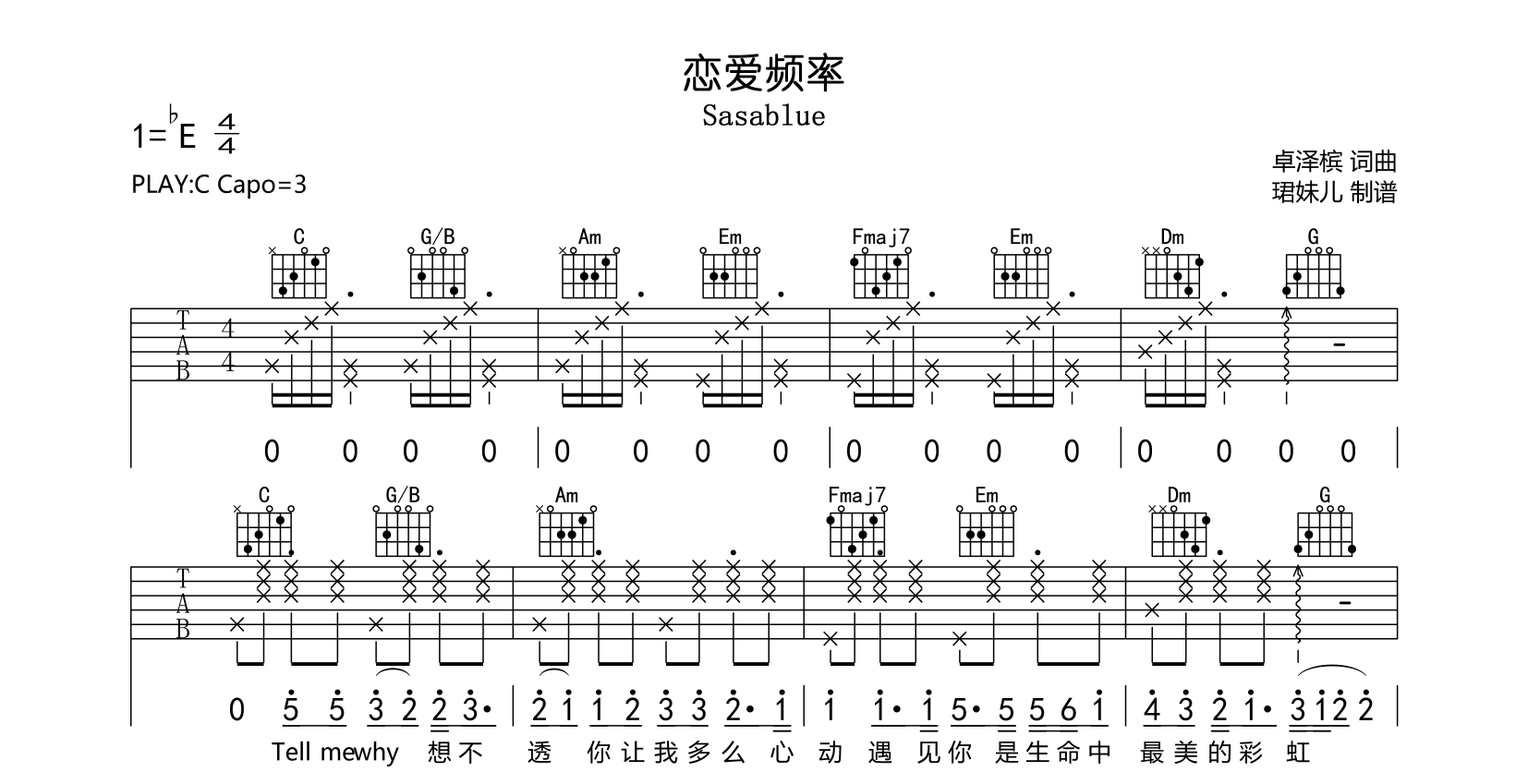 曲谱介绍: Sasablue《恋爱频率》吉他谱,由@珺妹儿制谱,《恋爱频率》吉他弹唱谱,共有两张图片谱,本谱采用C调指法编配,原调bE,弹唱建议变调夹3品,速度85BPM,节奏4/4拍,难度较简单,易上手。