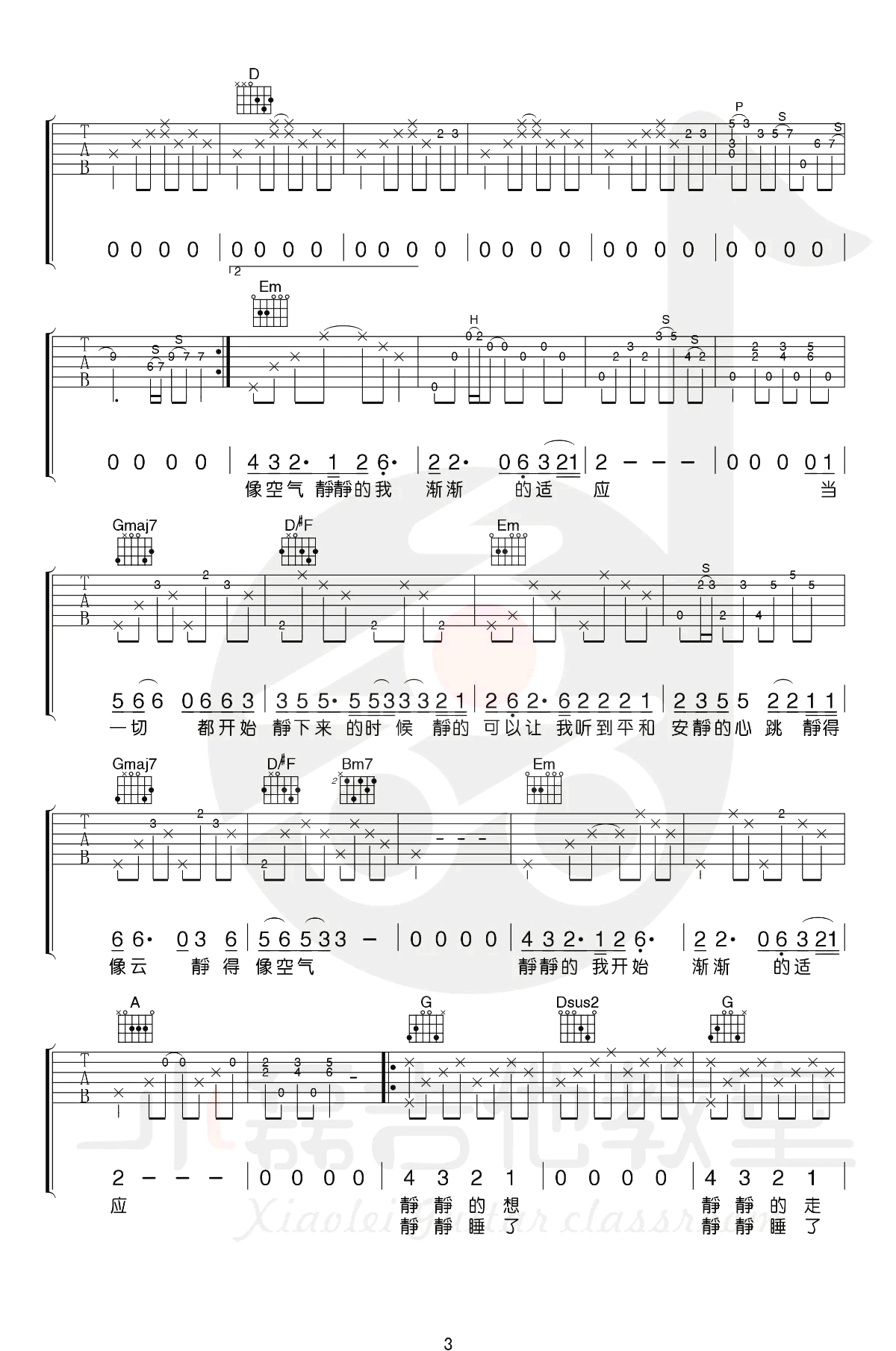 曲谱介绍: 赵雷《静下来》吉他弹唱谱,采用D调指法编配原版,共有4张高清图谱。
