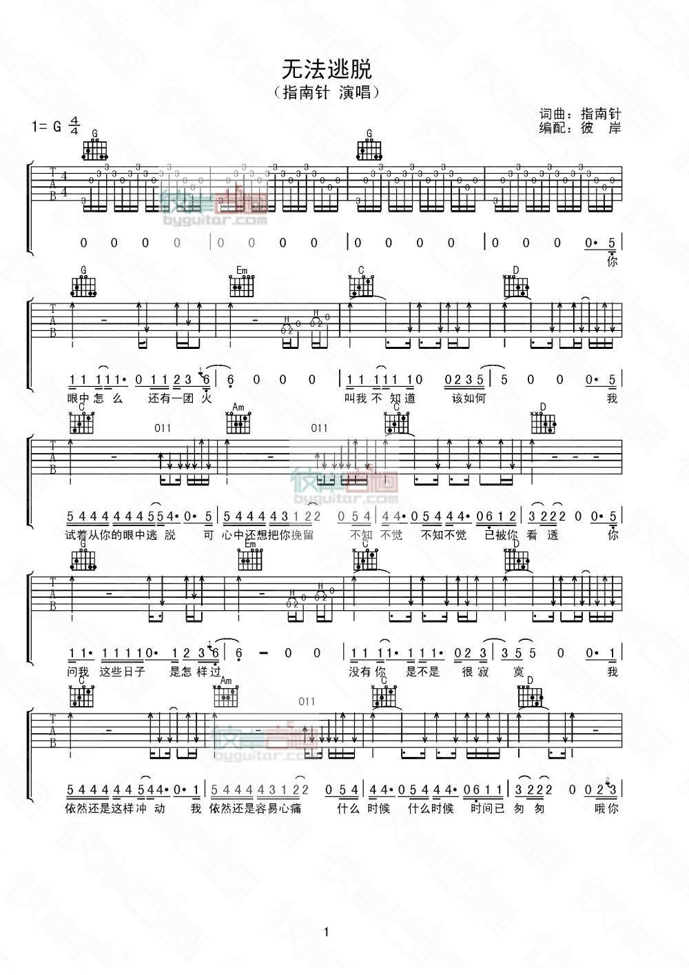 曲谱介绍: 指南针《无法逃脱》吉他弹唱谱,采用G调指法编配,共有3张高清图谱。
