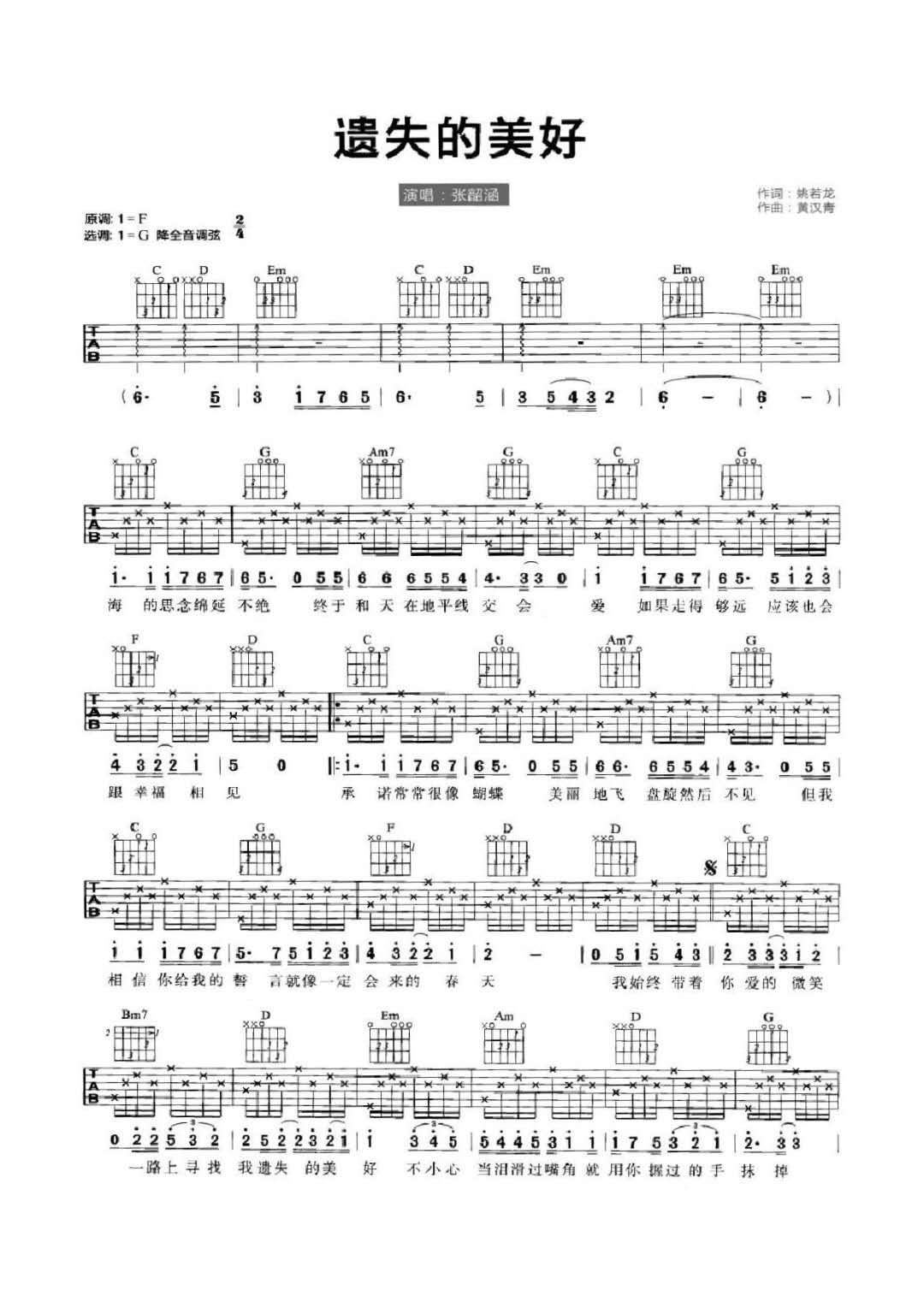 曲谱介绍: 张韶涵《遗失的美好》吉他弹唱谱,采用C调指法编配,共有2张高清图谱,免翻页排版设计。