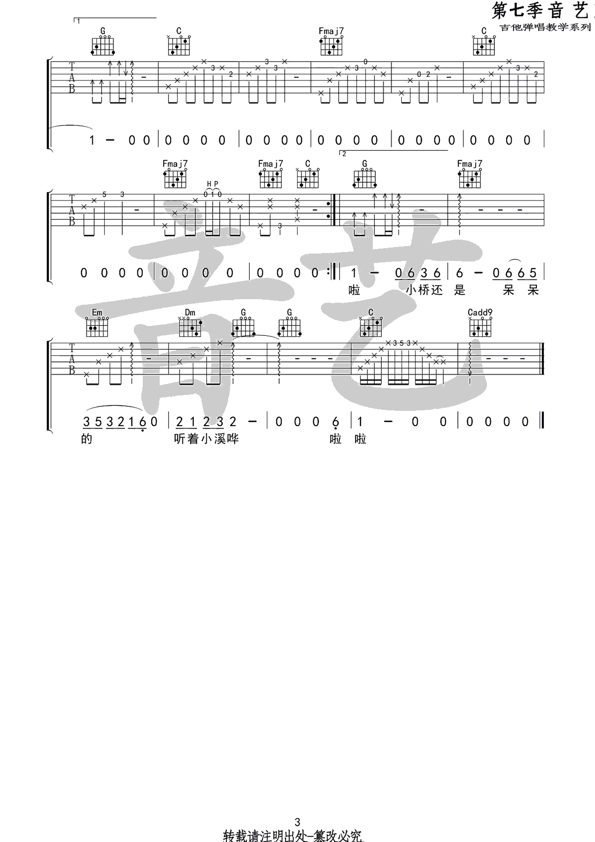 曲谱介绍: 暗杠《小桥》吉他弹唱谱,采用C调指法编配,共有3张高清图谱。