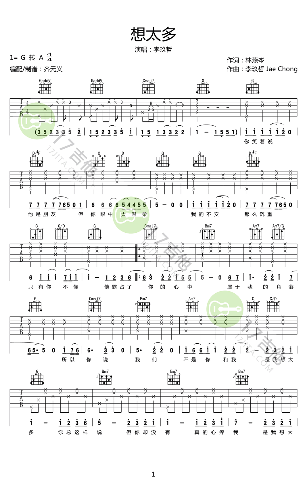 想太多吉他谱 - 李玖哲 - G调吉他弹唱谱 - 原版
