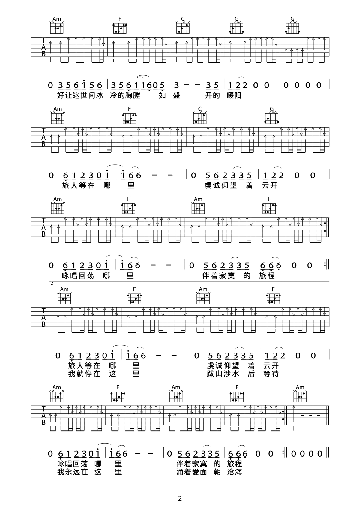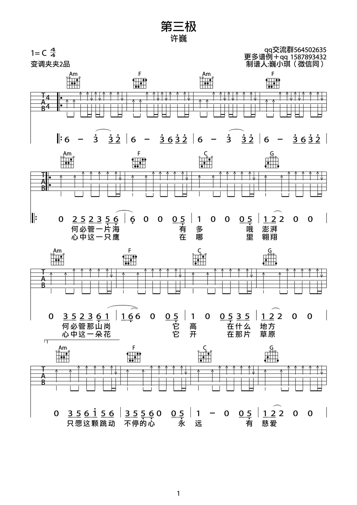 曲谱介绍: 许巍《第三极》吉他弹唱谱,采用C调指法编配,共有2张高清图谱,免翻页排版设计。
