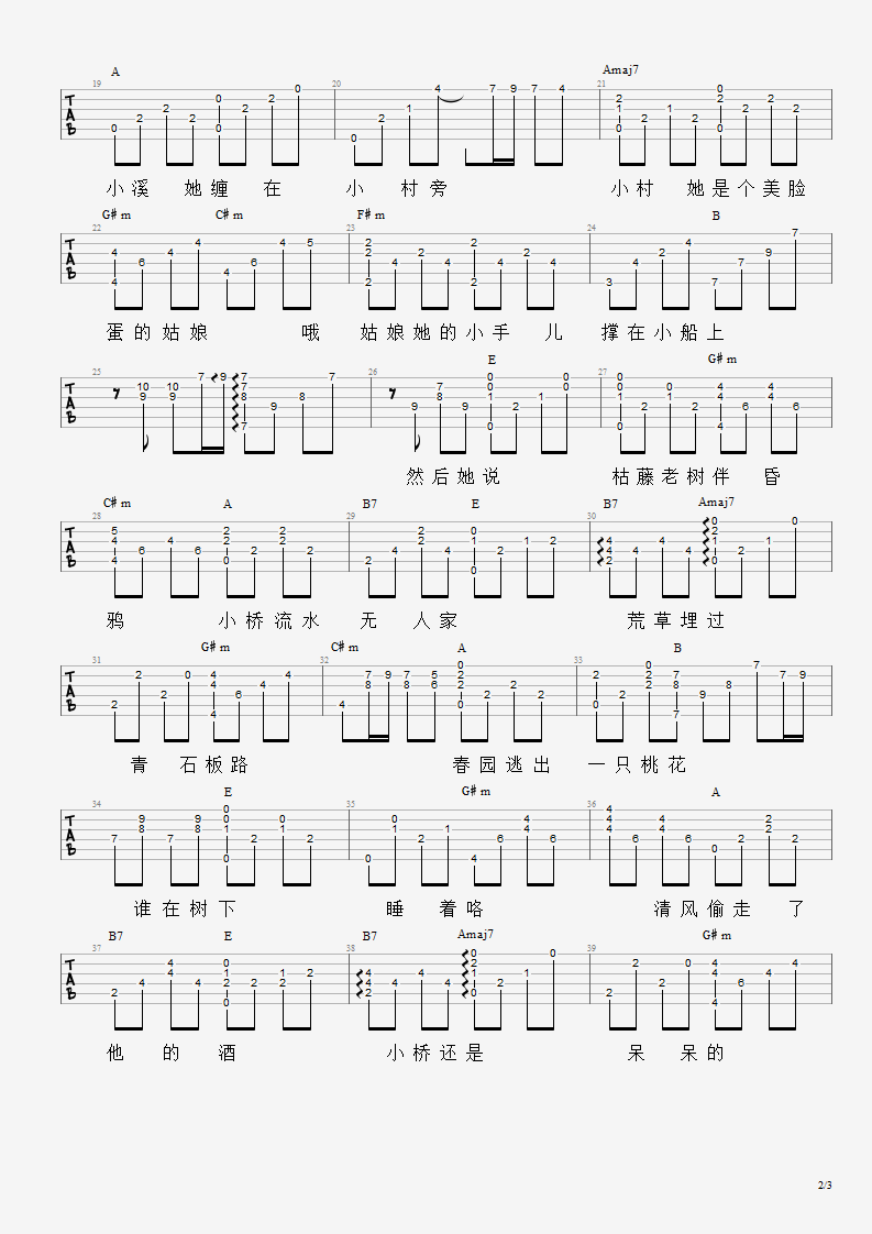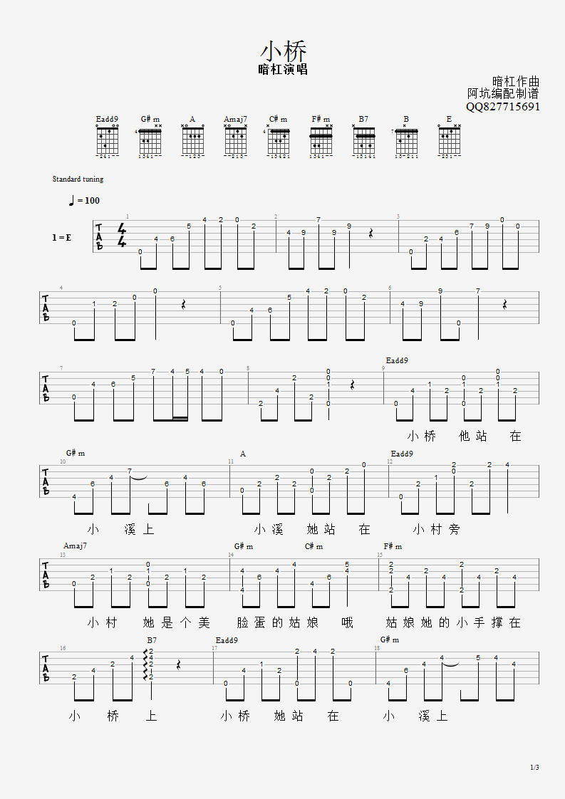 曲谱介绍: 暗杠《小桥》吉他弹唱谱,采用E调指法编配原版,共有3张高清图谱。