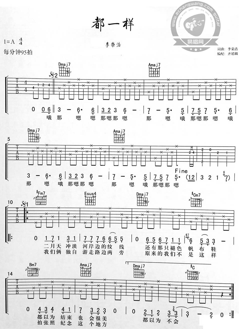 都一样吉他谱 - 李荣浩 - A调吉他弹唱谱 - 原版