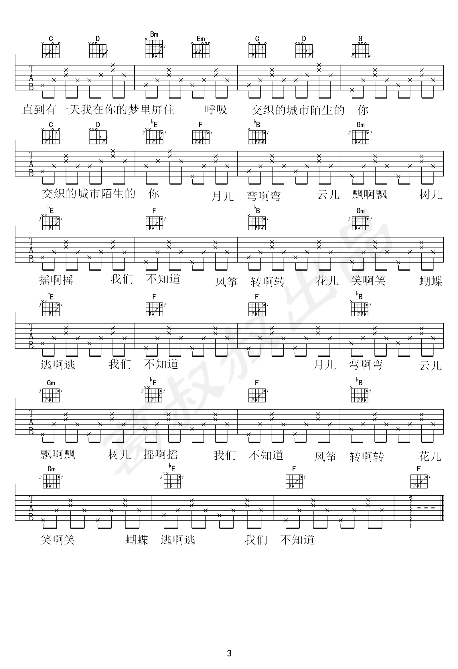 曲谱介绍: 张尧《我们不知道》吉他弹唱谱,采用G调指法编配,共有3张高清图谱。