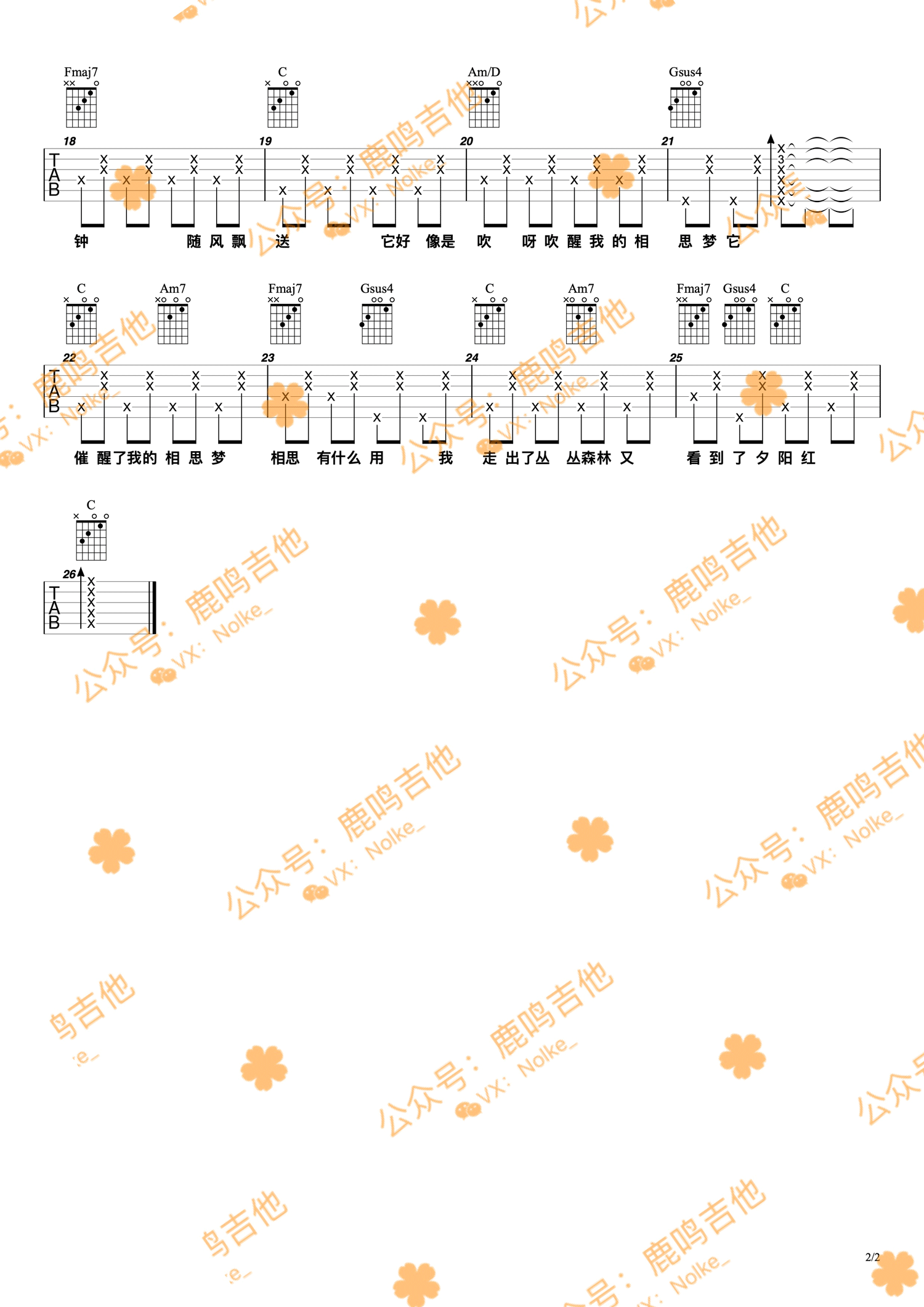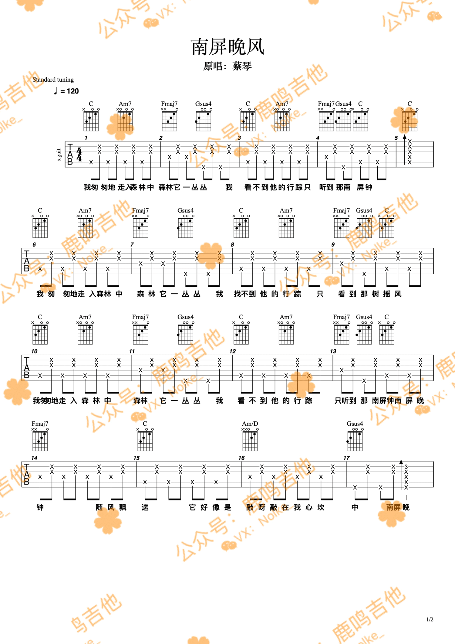曲谱介绍: 蔡琴《南屏晚钟》吉他弹唱谱,采用C调指法编配,共有2张高清图谱,免翻页排版设计。