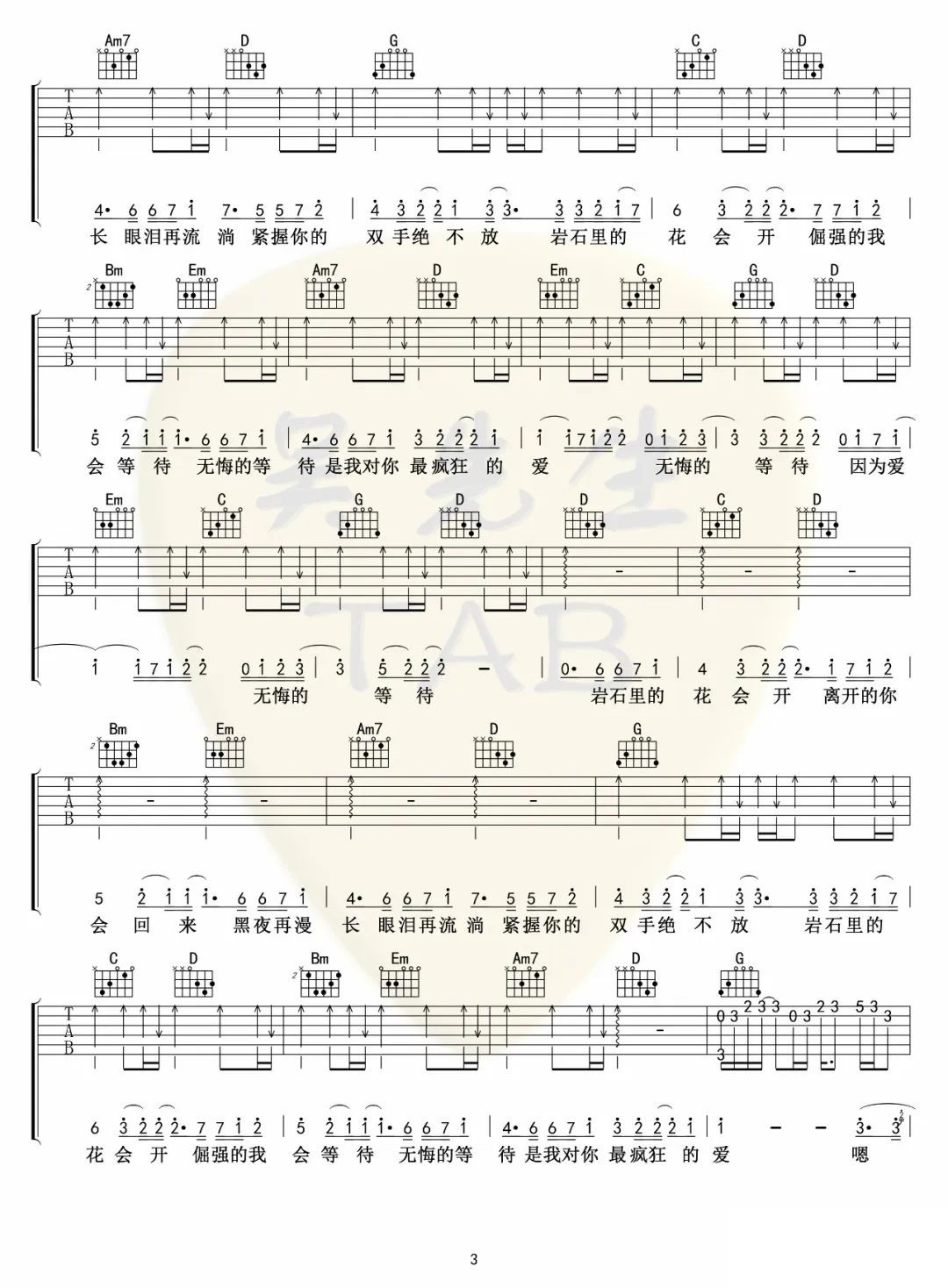 曲谱介绍: 邓紫棋《岩石里的花》吉他弹唱谱,采用G调指法编配原版,共有4张高清图谱。
