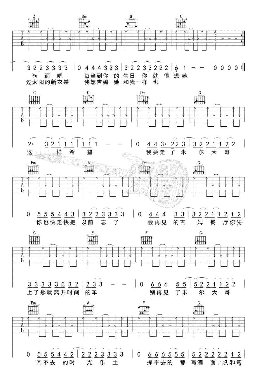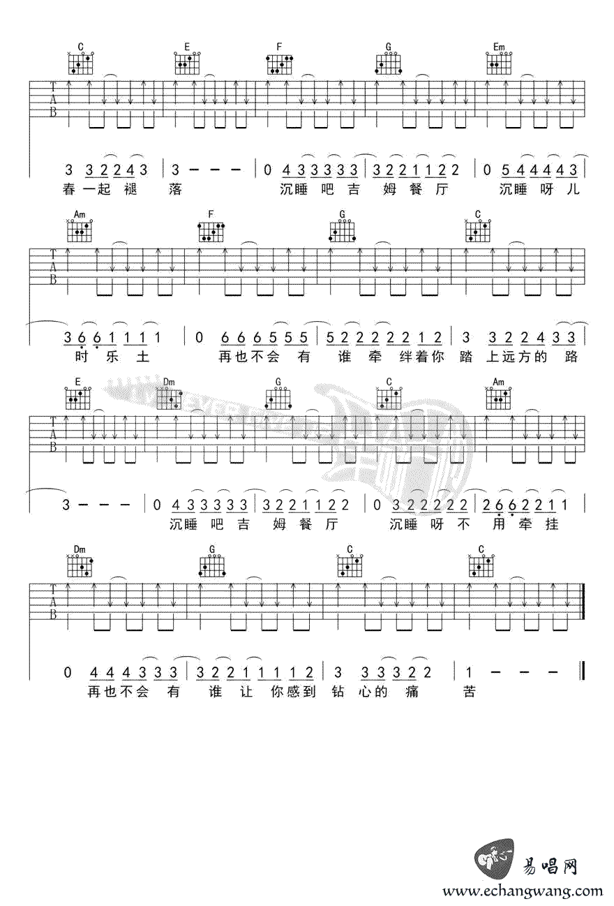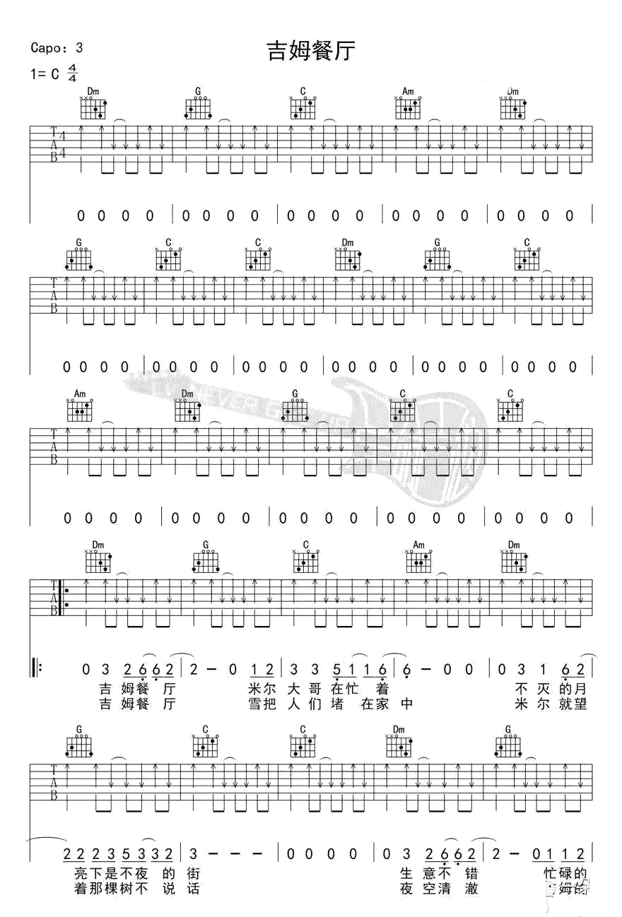 曲谱介绍: 赵雷《吉姆餐厅》吉他弹唱谱,采用C调指法编配,共有4张高清图谱。