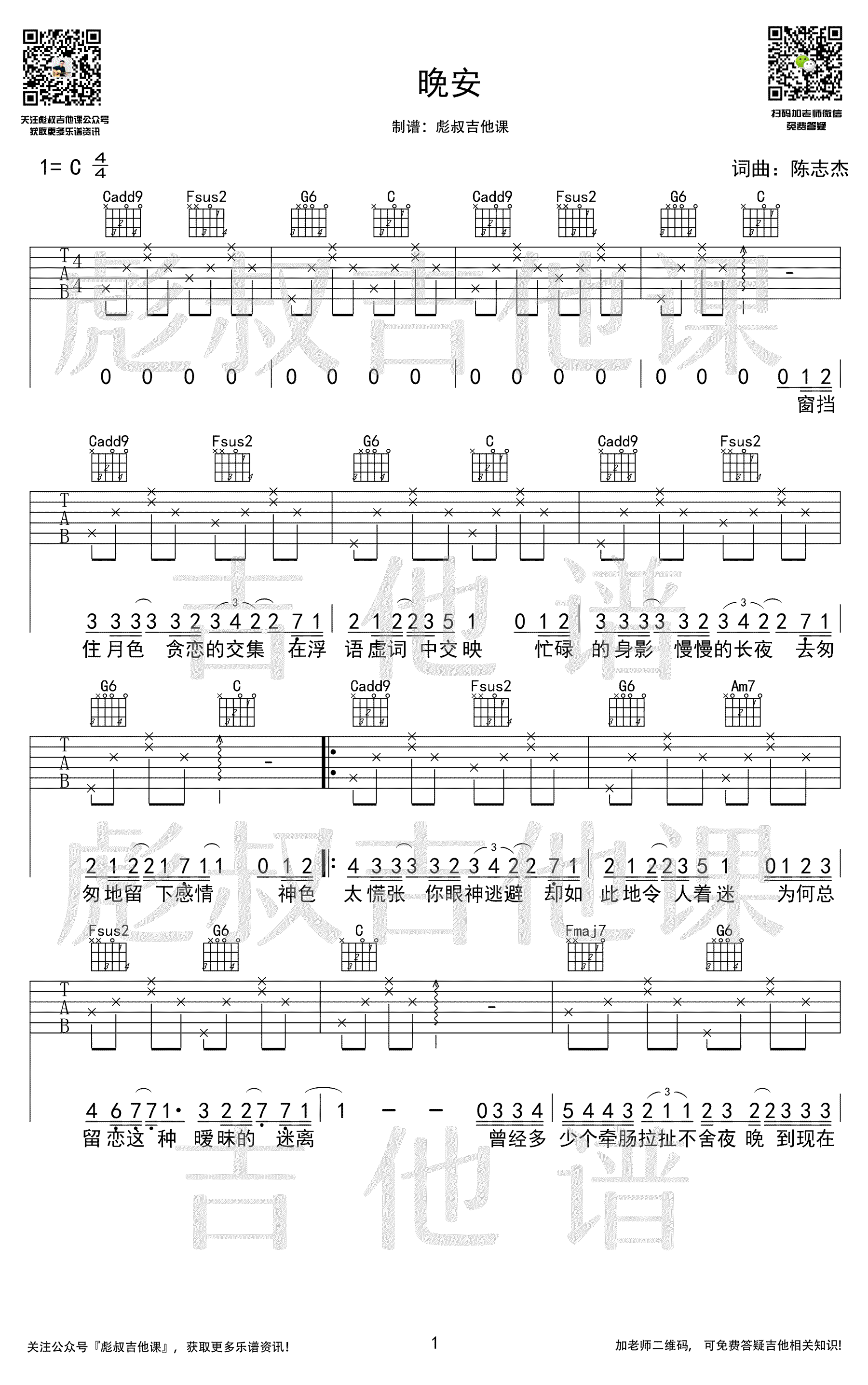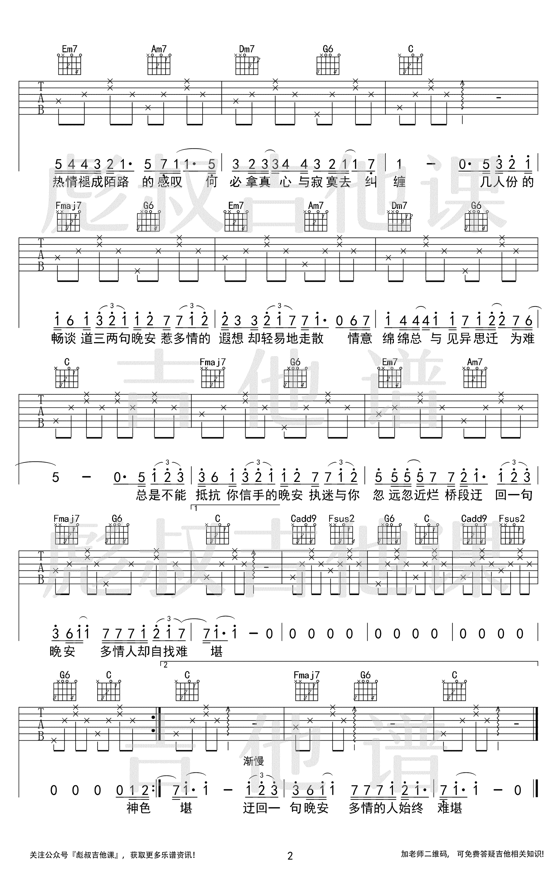 曲谱介绍: 颜人中《晚安》吉他弹唱谱,采用C调指法编配,共有2张高清图谱,免翻页排版设计。