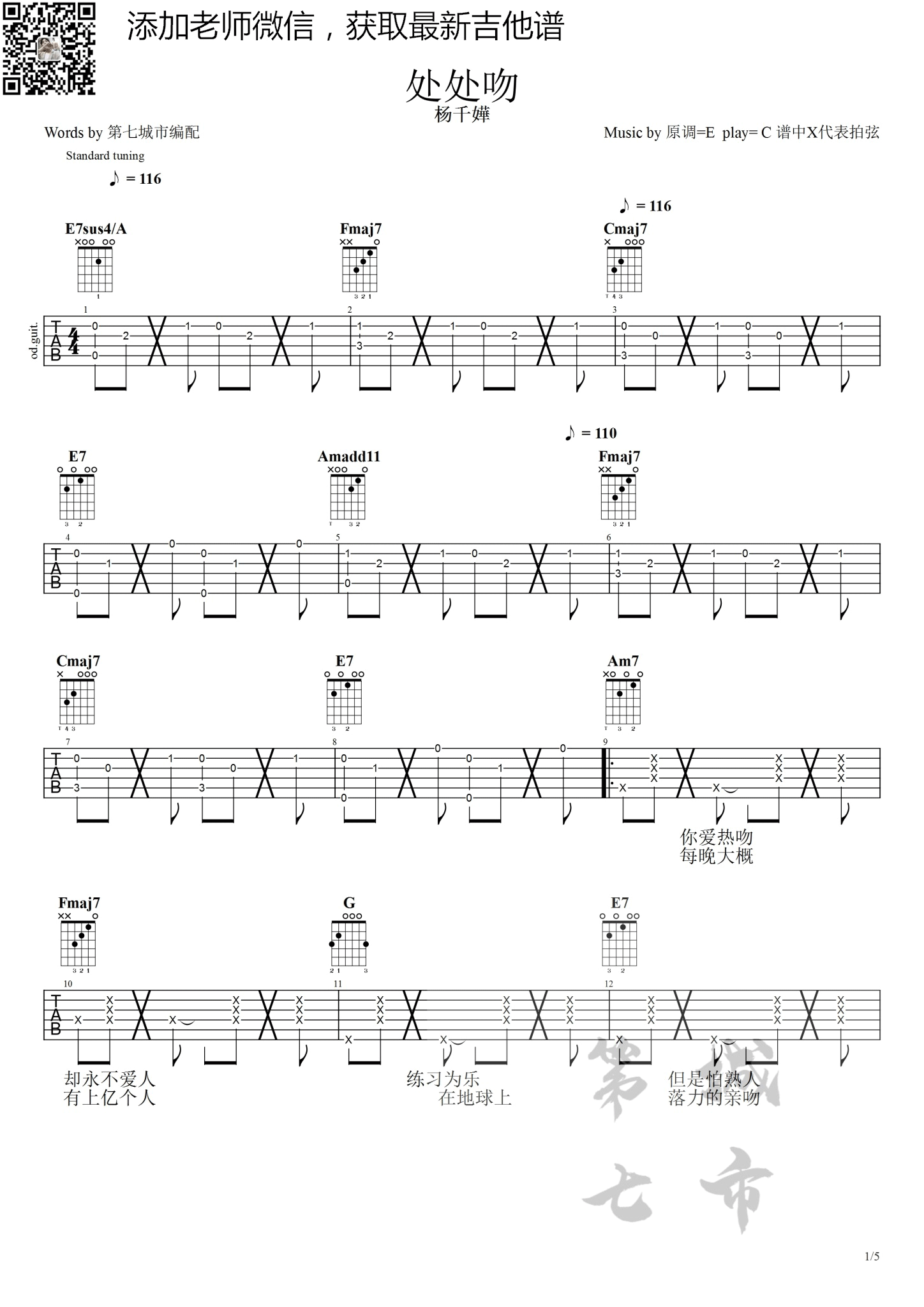 曲谱介绍: 杨千嬅《处处吻》吉他弹唱谱,采用C调指法编配,共有4张高清图谱。