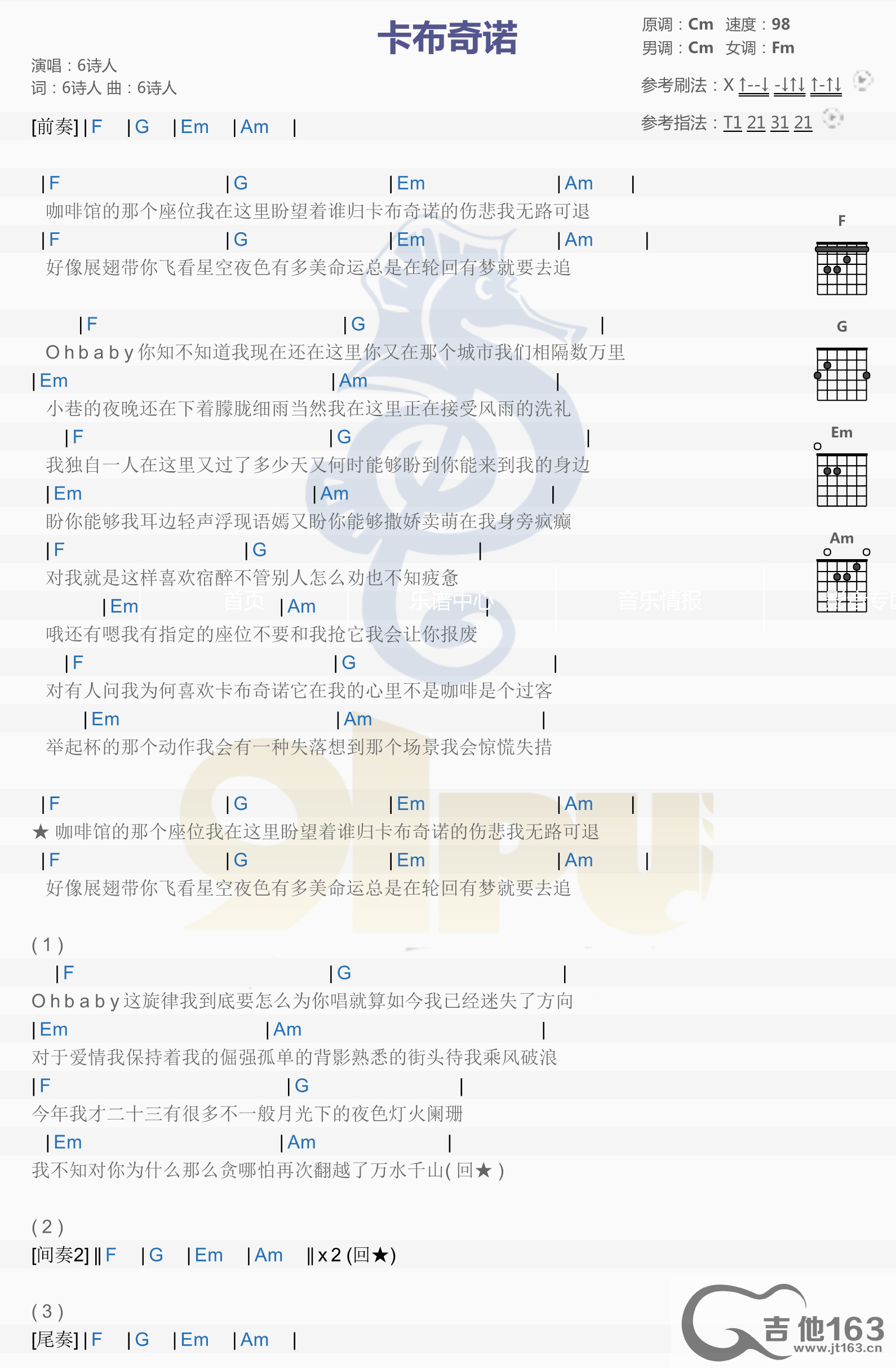 曲谱介绍: 6诗人《卡布奇诺》吉他弹唱谱,采用C调指法编配,共有1张高清图谱,免翻页排版设计。