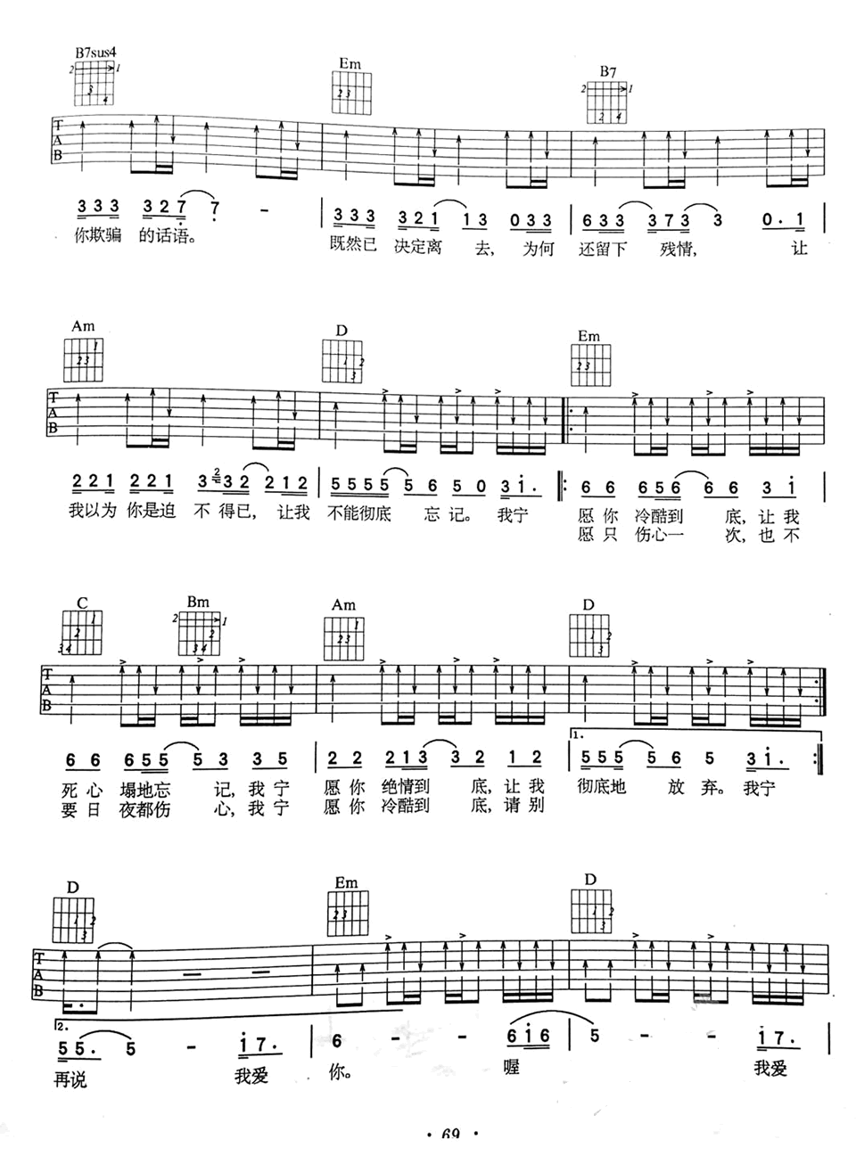 曲谱介绍: 羽泉《冷酷到底》吉他弹唱谱,采用G调指法编配,共有3张高清图谱。