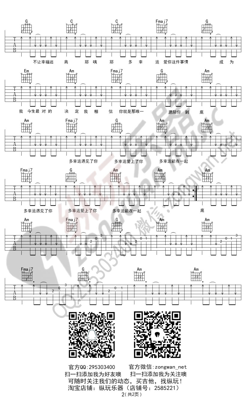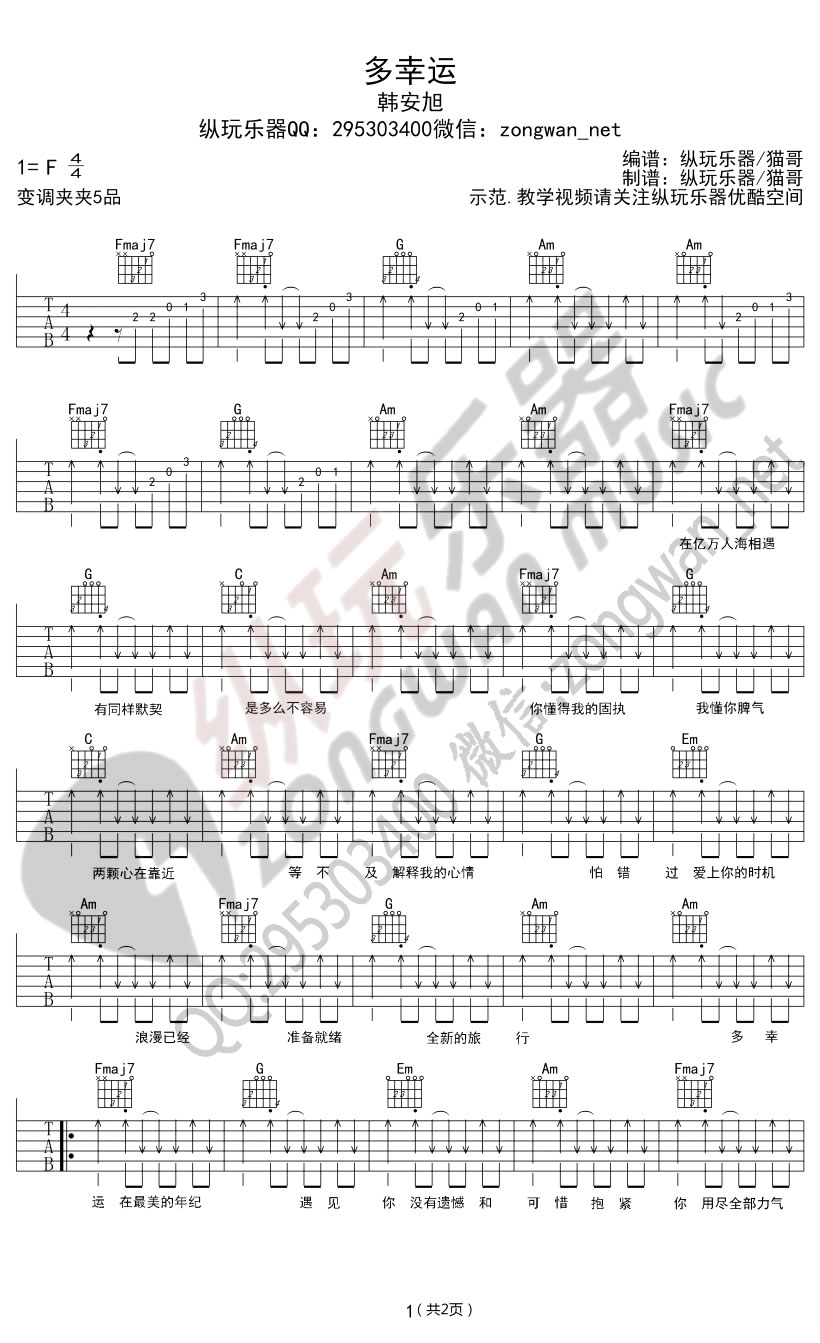 曲谱介绍: 韩安旭《多幸运》吉他弹唱谱,采用C调指法编配,共有2张高清图谱,免翻页排版设计。