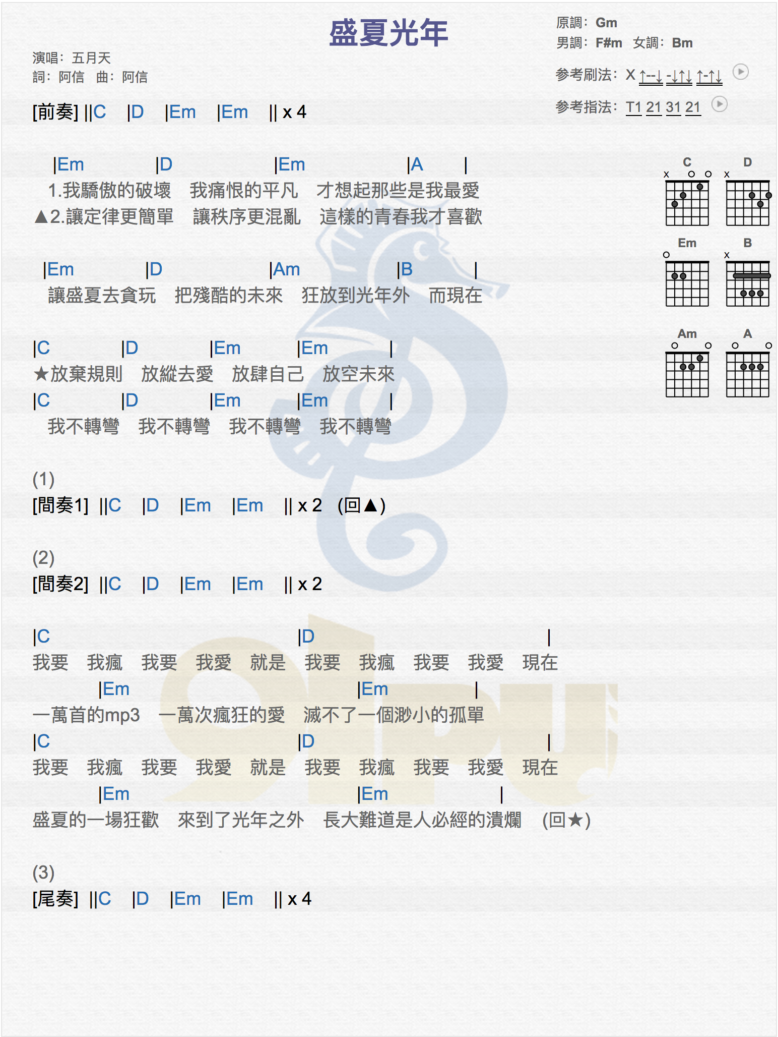 盛夏光年吉他谱 - 五月天/陈冰 - G调吉他弹唱谱