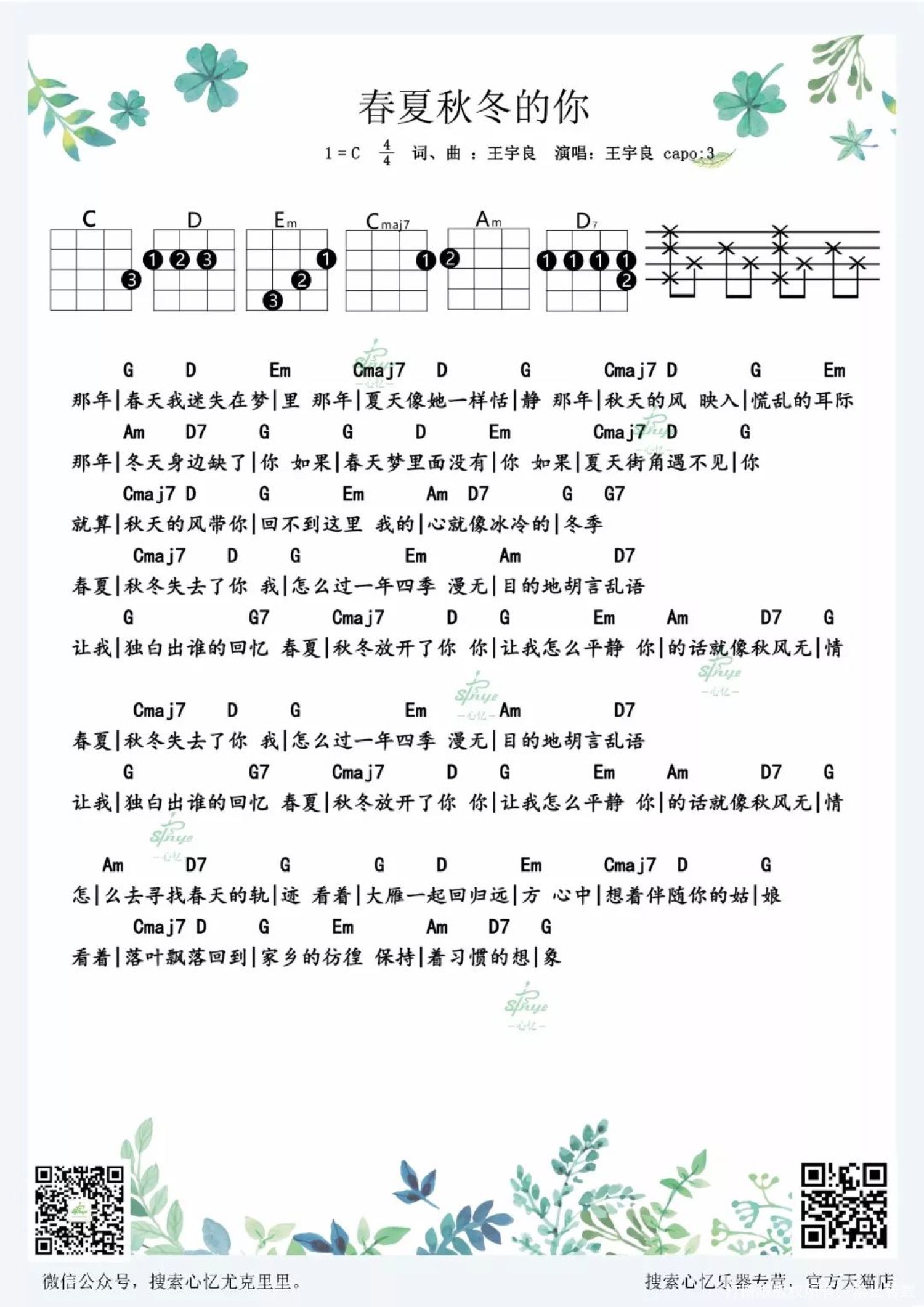 曲谱介绍: 《春夏秋冬的你》尤克里里谱 今天给大家推荐的是 王宇良演唱的《春夏秋冬的你》 由他自己作词作曲 收录在同名专辑《春夏秋冬的你》 治愈系的嗓音营造出温暖舒缓的情绪 它勾起了听者的回忆 我们每个人都可能曾经 有一个迷失在了春夏秋冬里的你 我们怀念着过去的美好 却无法释怀那份失去的缘分