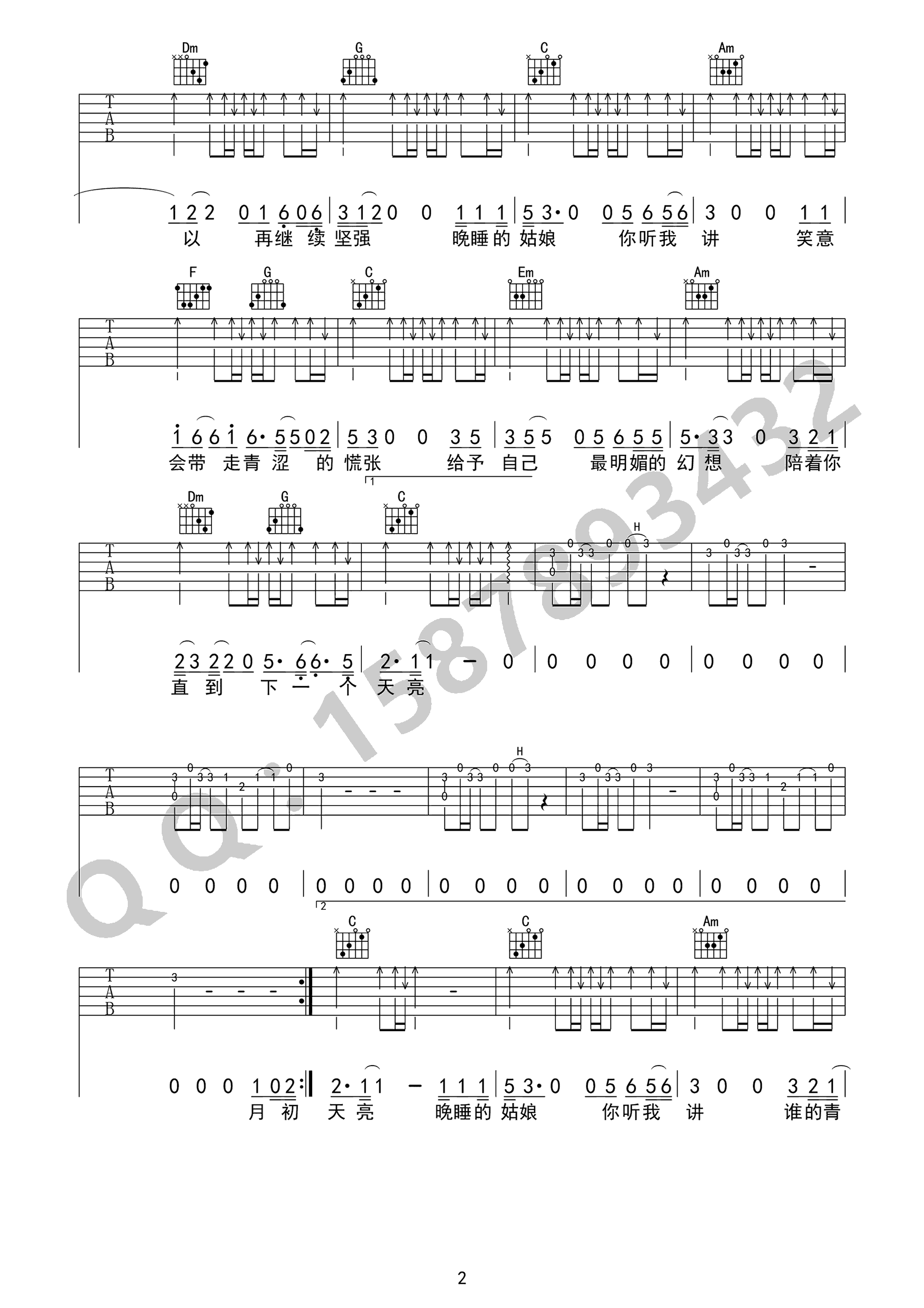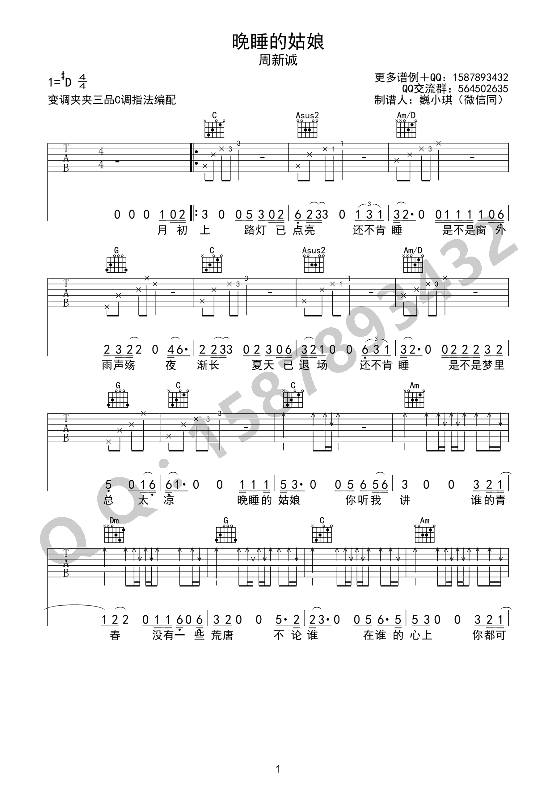 曲谱介绍: 周新诚《晚睡的姑娘》吉他弹唱谱,采用C调指法编配,共有3张高清图谱。