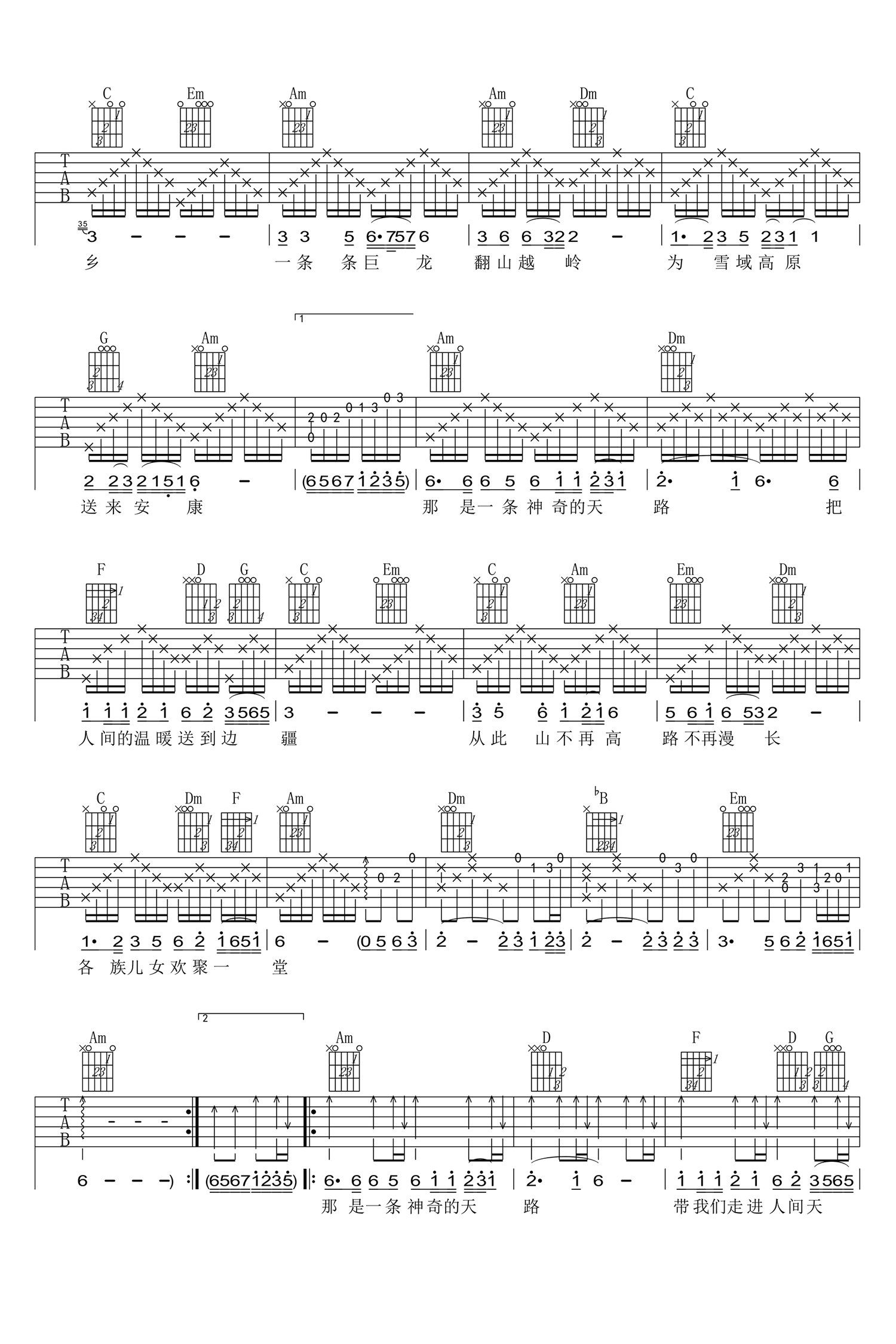 曲谱介绍: 韩红《天路》吉他弹唱谱,采用C调指法编配原版,共有3张高清图谱。