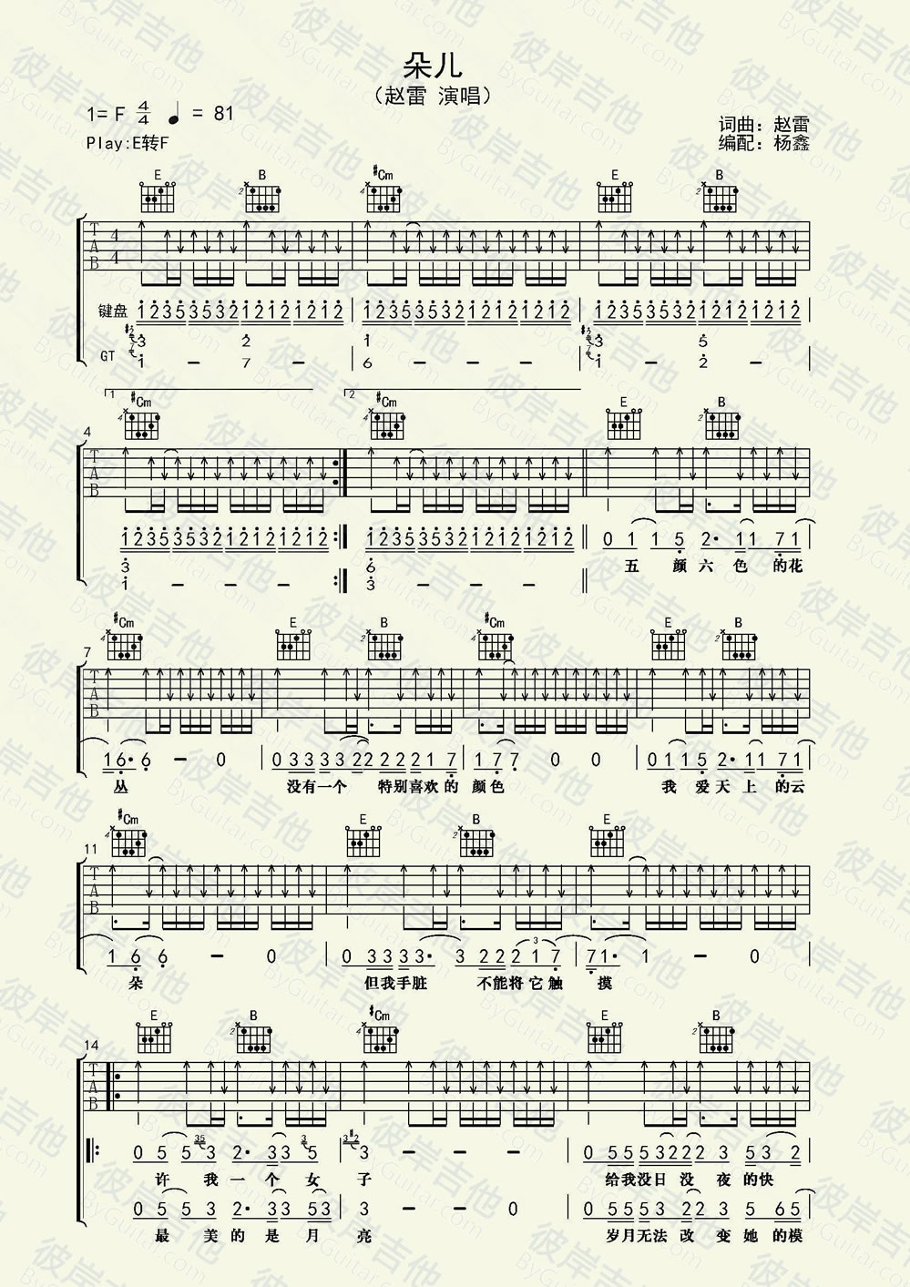 曲谱介绍: 赵雷《朵儿》吉他弹唱谱,采用E调指法编配,共有2张高清图谱,免翻页排版设计。