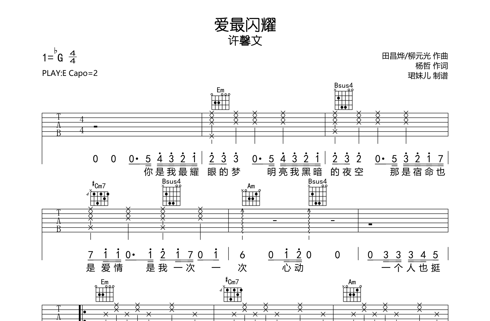 曲谱介绍: 许馨文《爱最闪耀》吉他谱,由@珺妹儿制谱,《爱最闪耀》吉他弹唱谱,共有两张图片谱,本谱采用E调指法编配,原调bG,弹唱建议变调夹2品,速度85BPM,难度较简单,易上手。