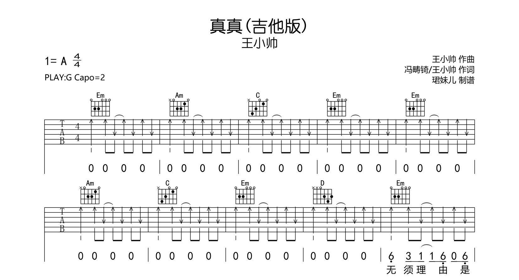 真真吉他谱 - 王小帅 - G调吉他弹唱谱