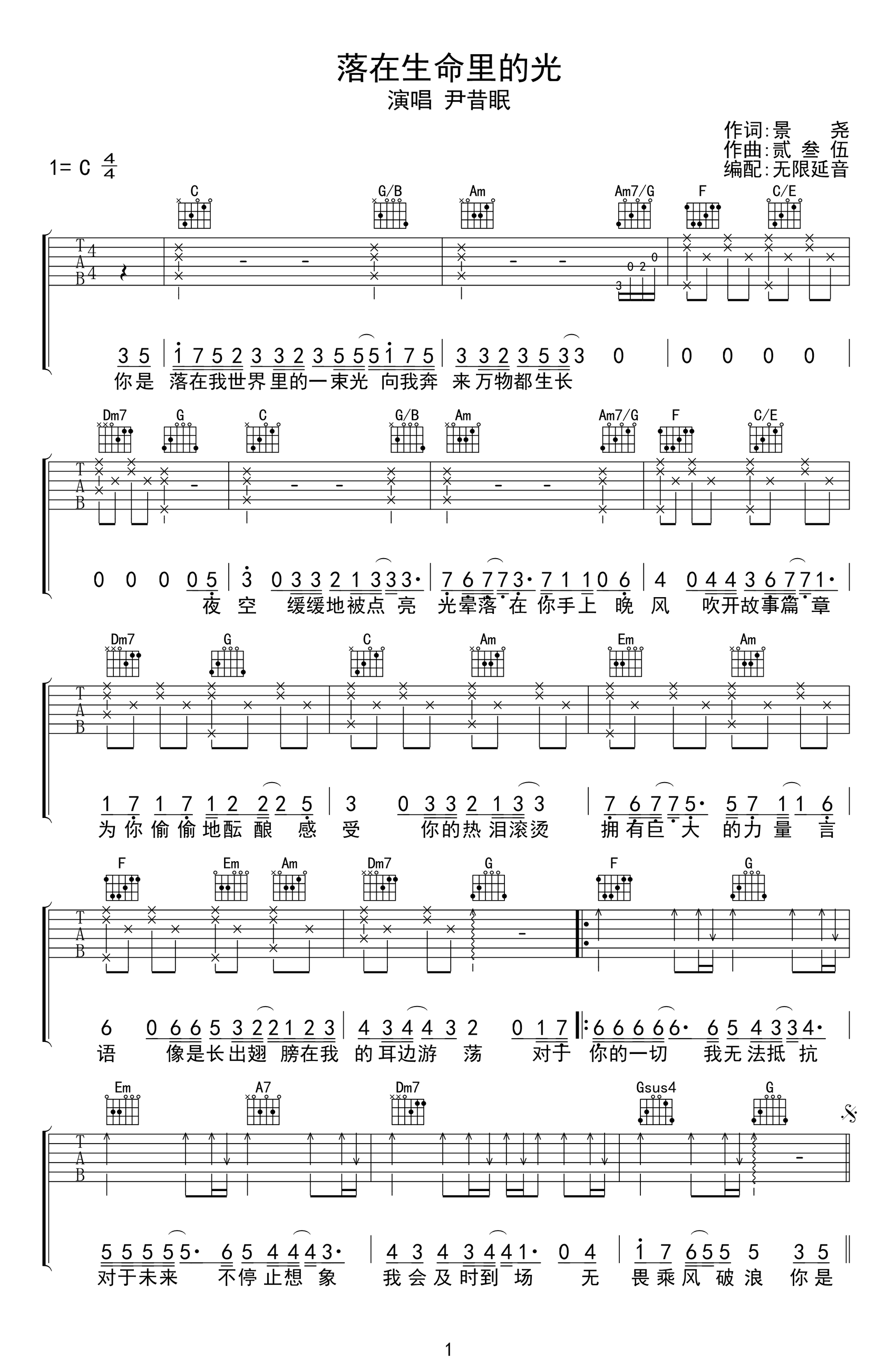 落在生命里的光吉他谱 - 尹昔眠 - C调吉他弹唱谱