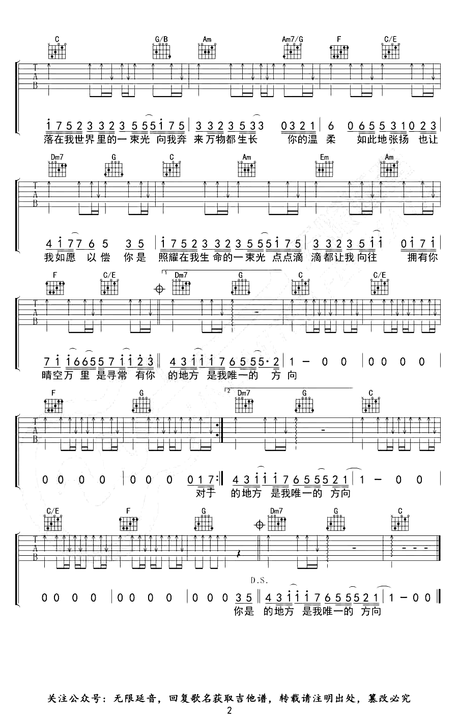 曲谱介绍: 《落在生命里的光》吉他六线谱,选用C调指法,两张弹唱图片谱。