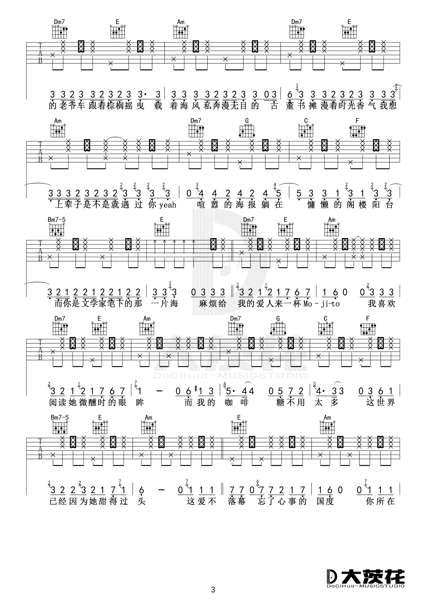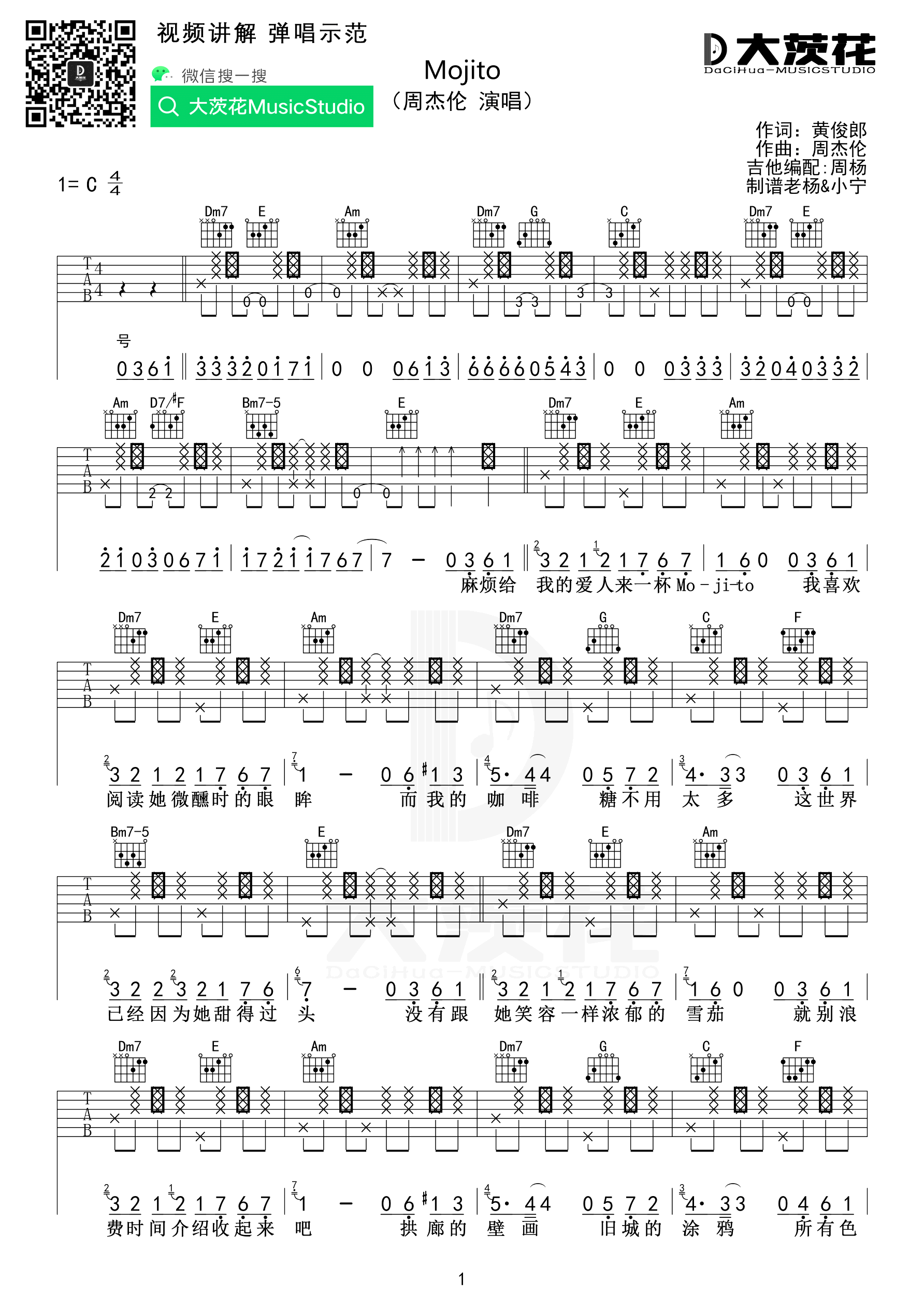 曲谱介绍: 周杰伦《Mojito》吉他弹唱谱,采用C调指法编配,共有4张高清图谱。