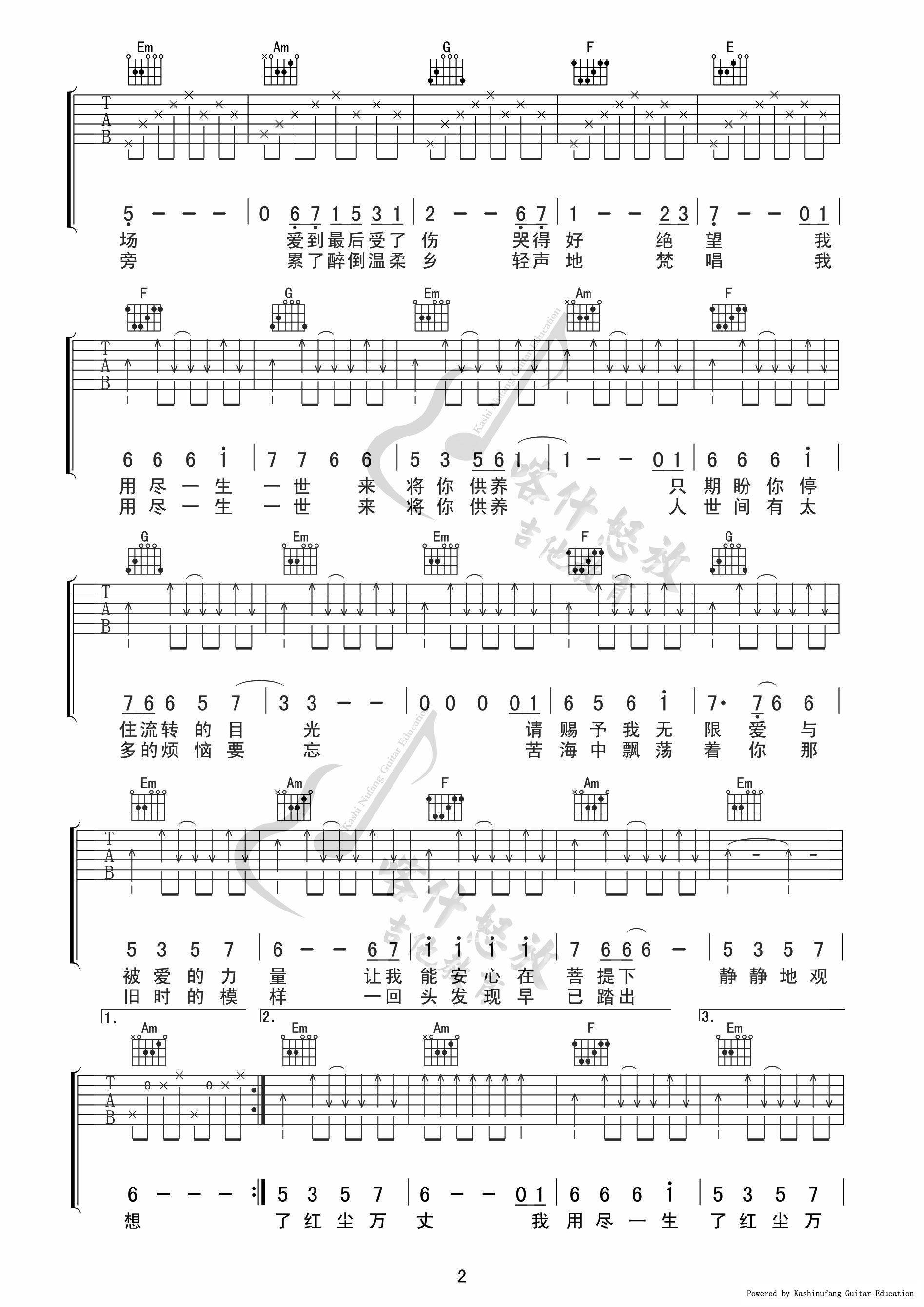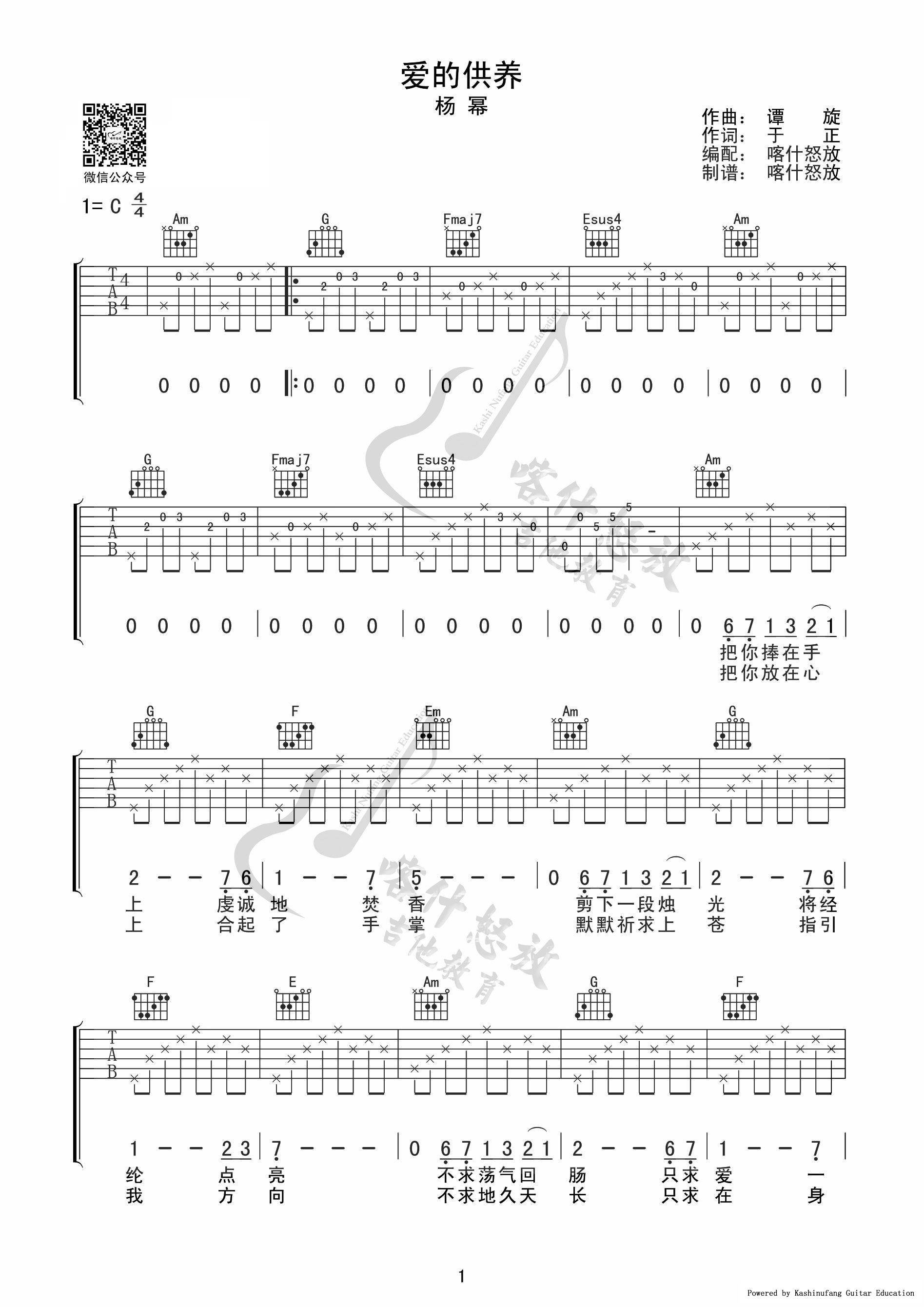 曲谱介绍: 杨幂《爱的供养》吉他弹唱谱,采用C调指法编配,共有3张高清图谱。
