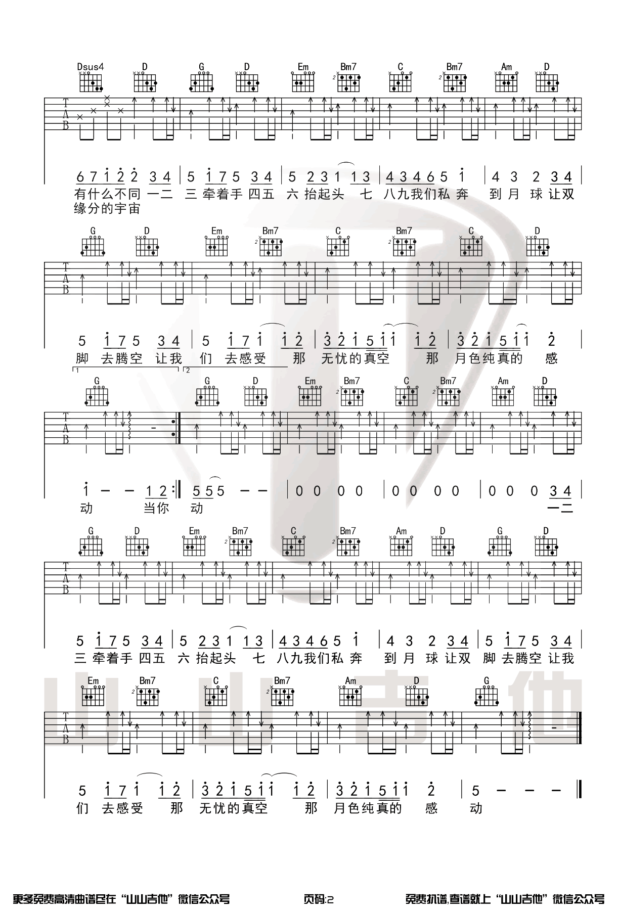 曲谱介绍: 五月天/陈绮贞《私奔到月球》吉他弹唱谱,采用G调指法编配,共有2张高清图谱,免翻页排版设计。