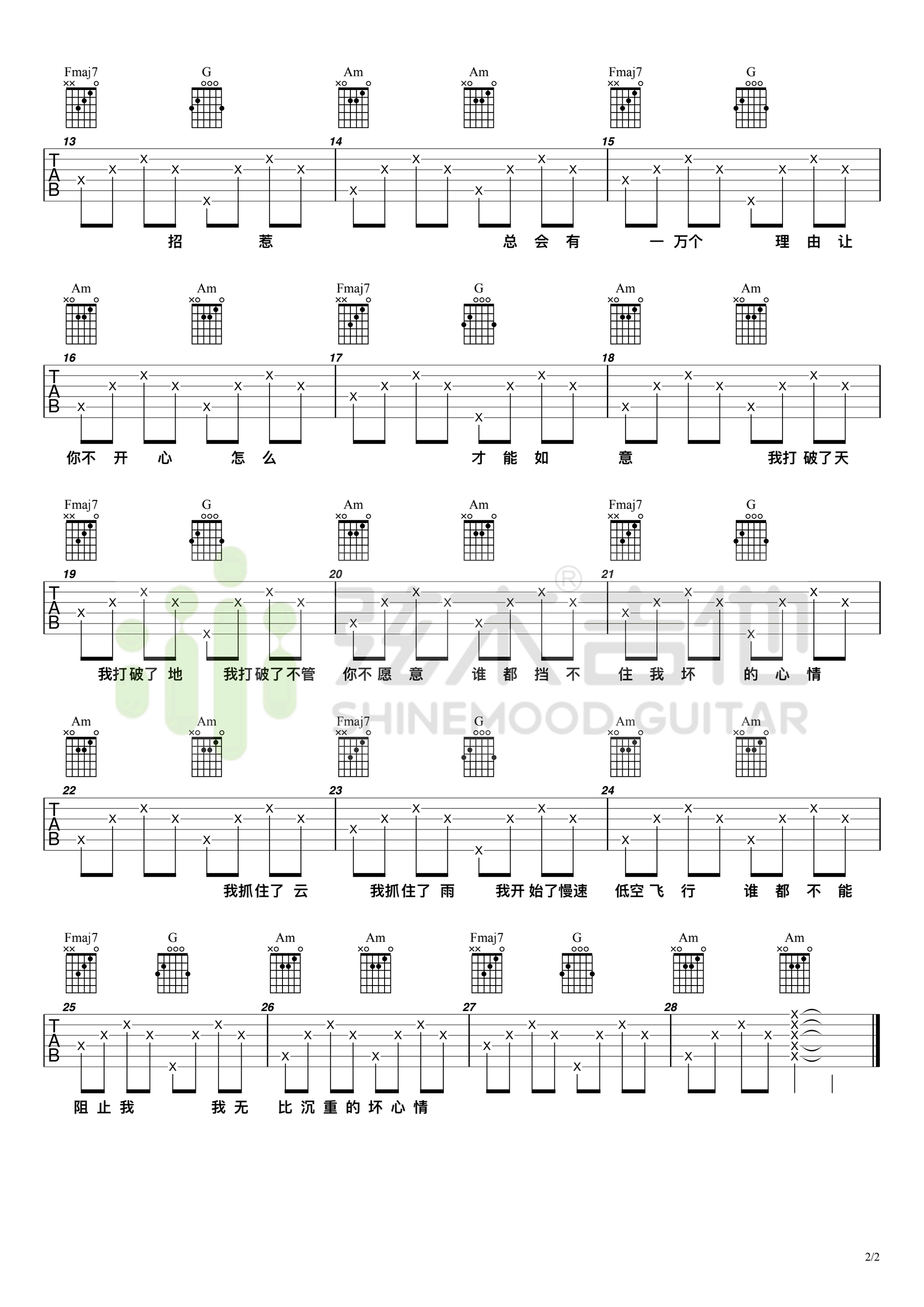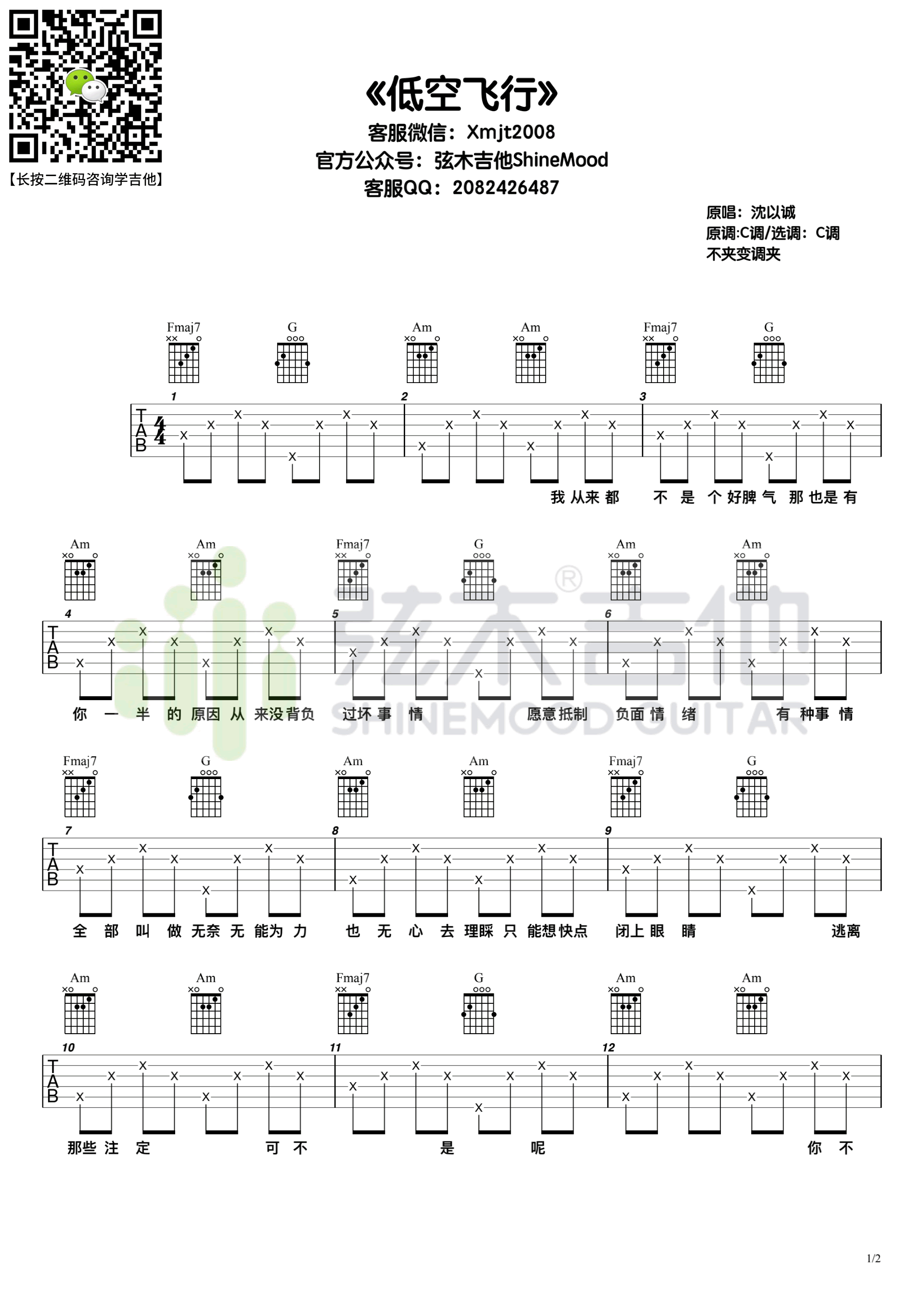 曲谱介绍: 沈以诚《低空飞行》吉他弹唱谱,采用C调指法编配,共有2张高清图谱,免翻页排版设计。