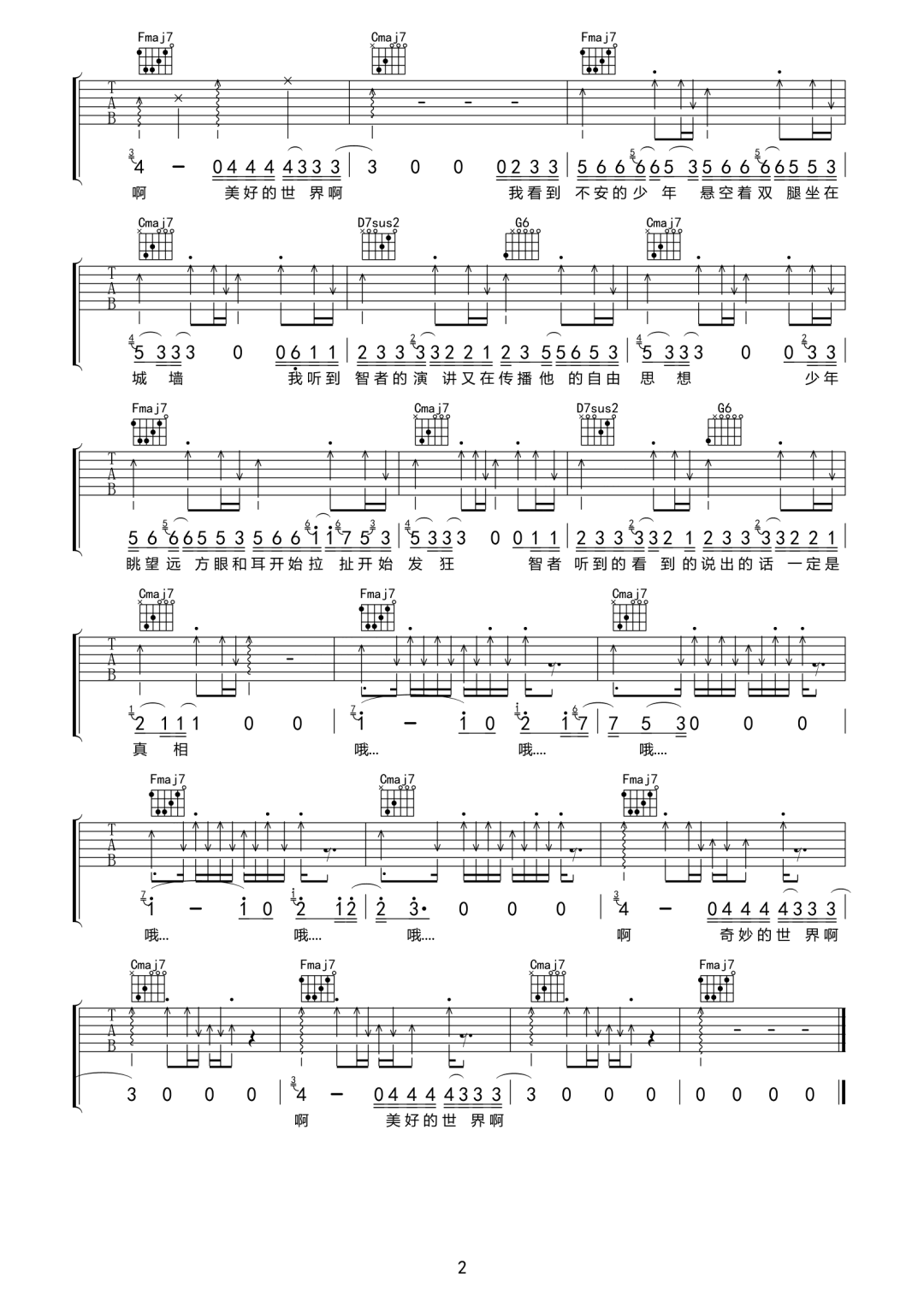 曲谱介绍: 刘思鉴《奇妙世界》吉他弹唱谱,采用C调指法编配,共有2张高清图谱,免翻页排版设计。